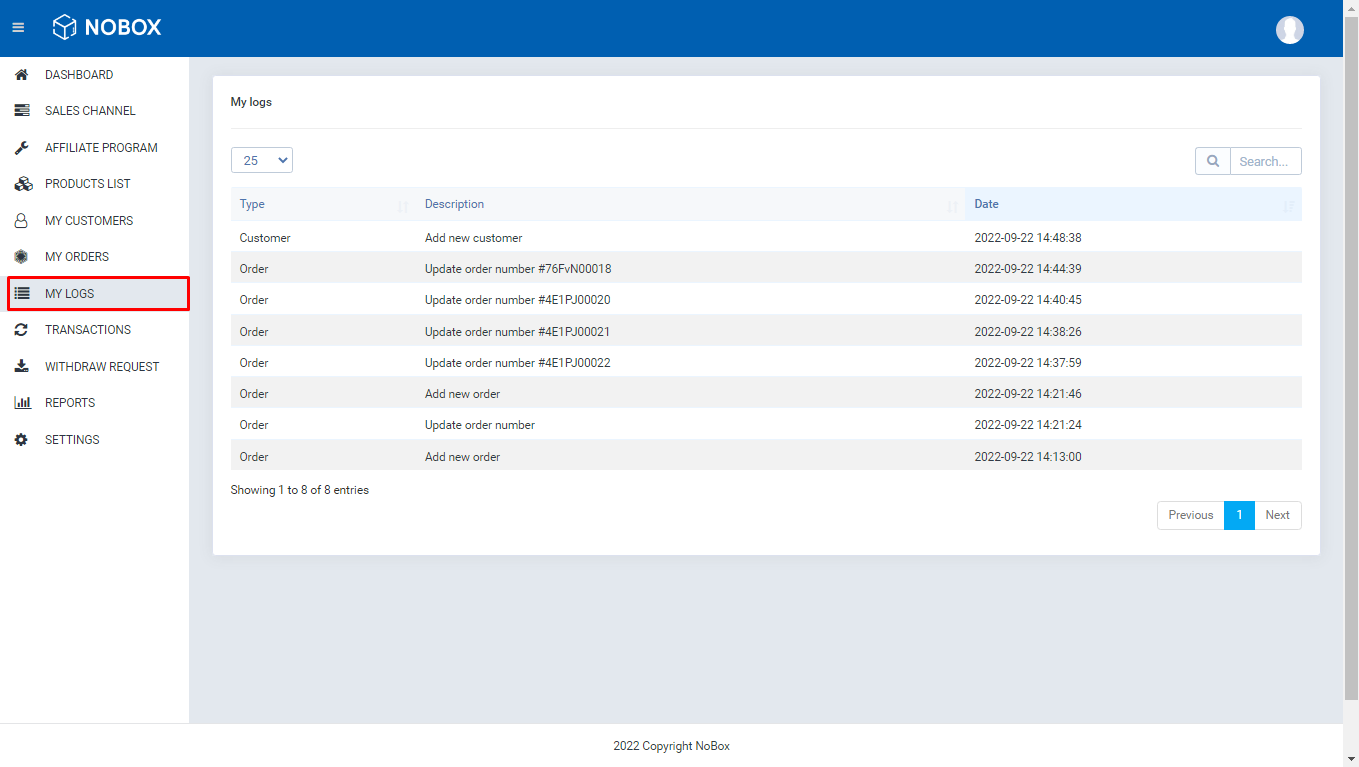 My Logs is a menu used to monitor activities in the affiliate CRM, such as adding orders, changing orders, and more