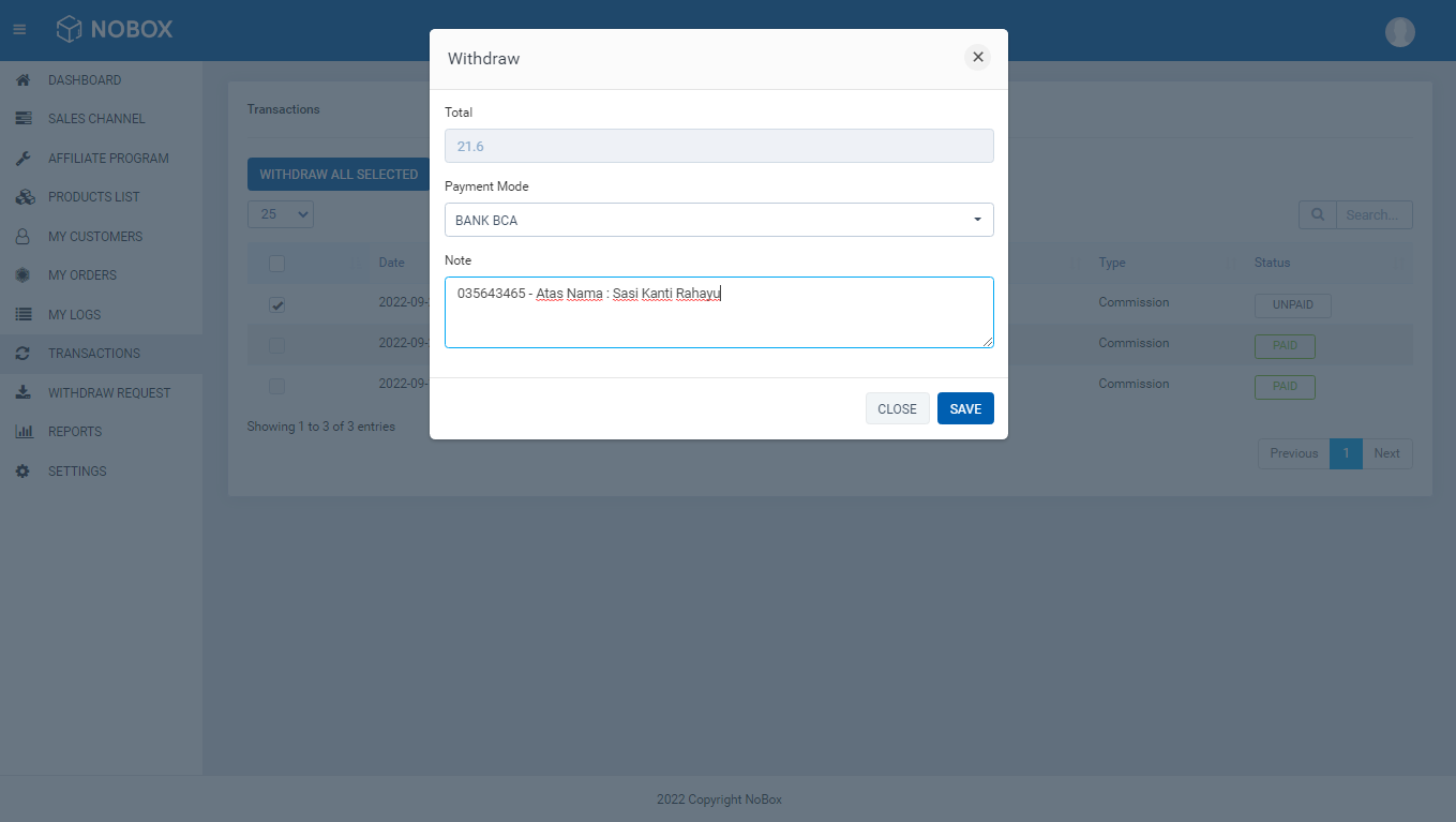 Transactions is a menu used for managing commissions from paid affiliate orders. To withdraw the commission, select the [Transactions] menu ➔ Click the checkbox to choose the commission you want to withdraw ➔ Click [Withdraw all selected]. A withdraw dialog will appear, then complete the fields in the dialog.