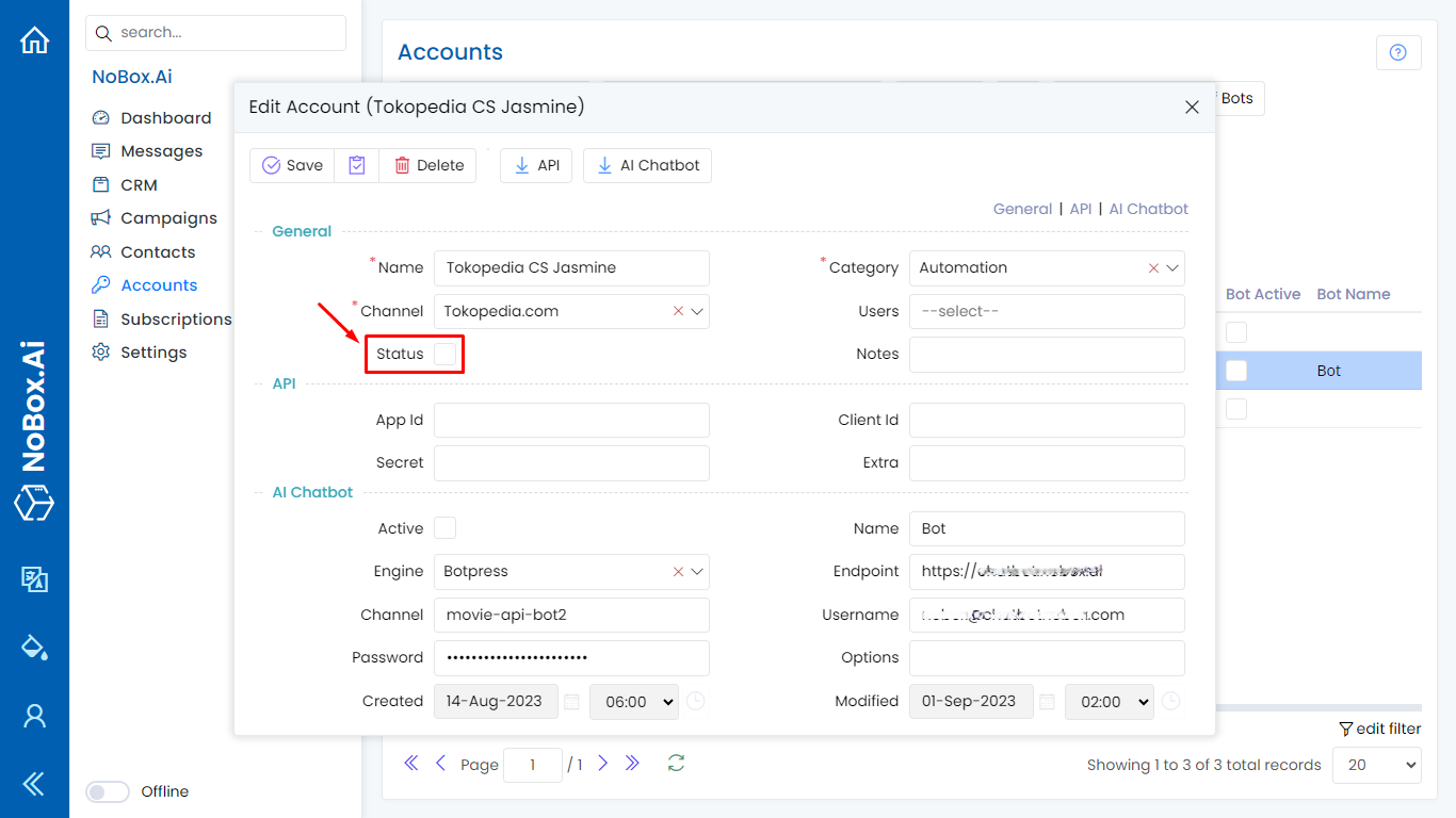 To edit an account, please open and log in to the website id.nobox.ai, click the [Accounts] menu. Choose the account you wish to edit, then proceed to edit your data and click [Save] to save the changes.