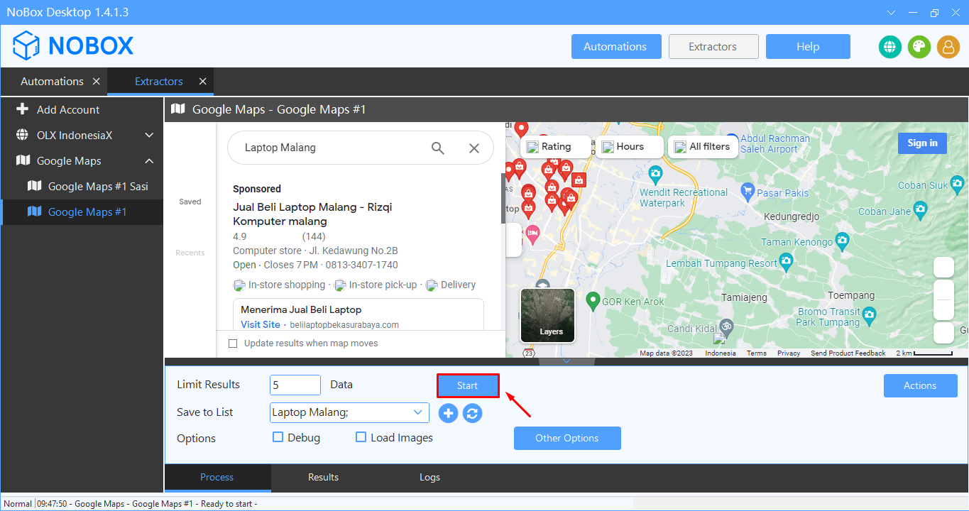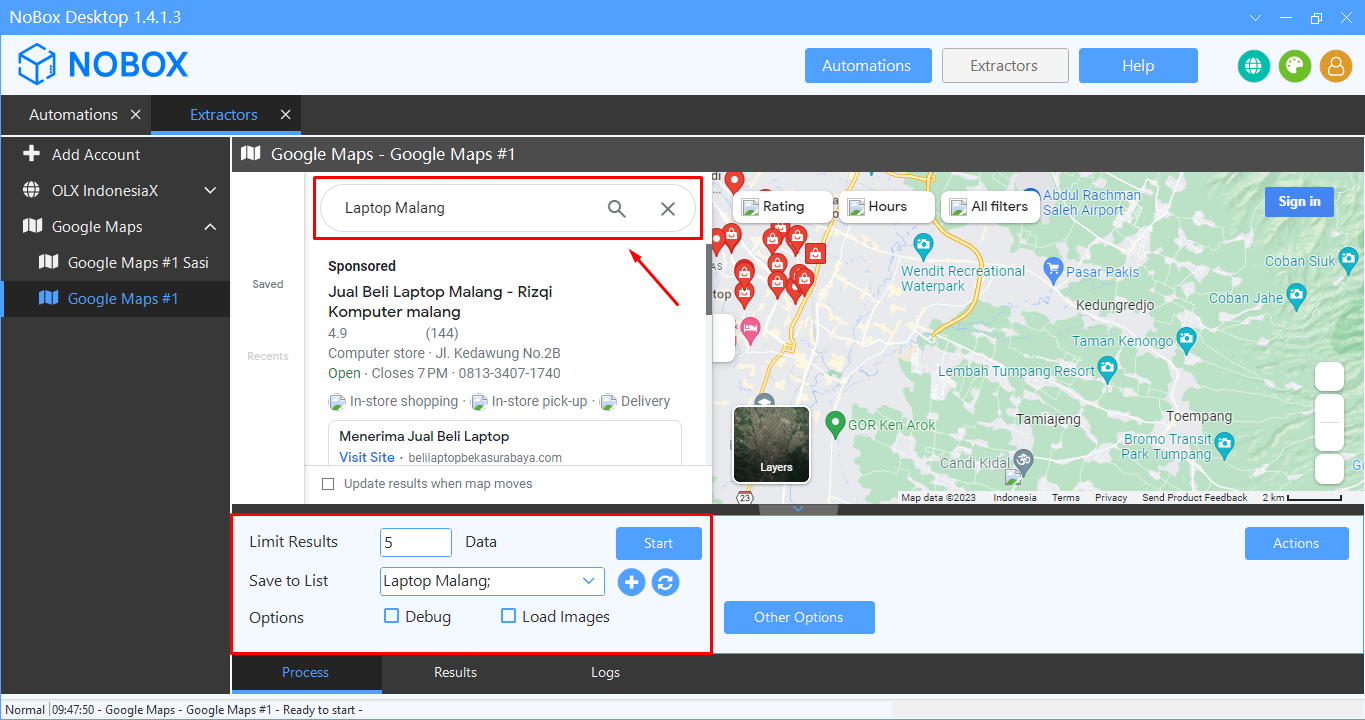 | Save to list | Select/add a data list to store the extracted data. | Laptop Malang |