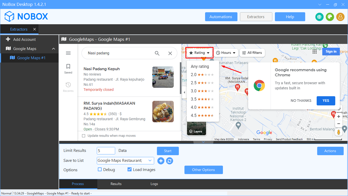 - Open Google Maps, enter the data to be retrieved in the [Search Google Maps] field, and select the desired rating.
