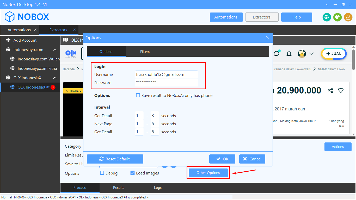 - Reopen the NoBox application and navigate to the [Extractor-> OLX] menu. A notification will appear stating that the previous process is not yet complete.