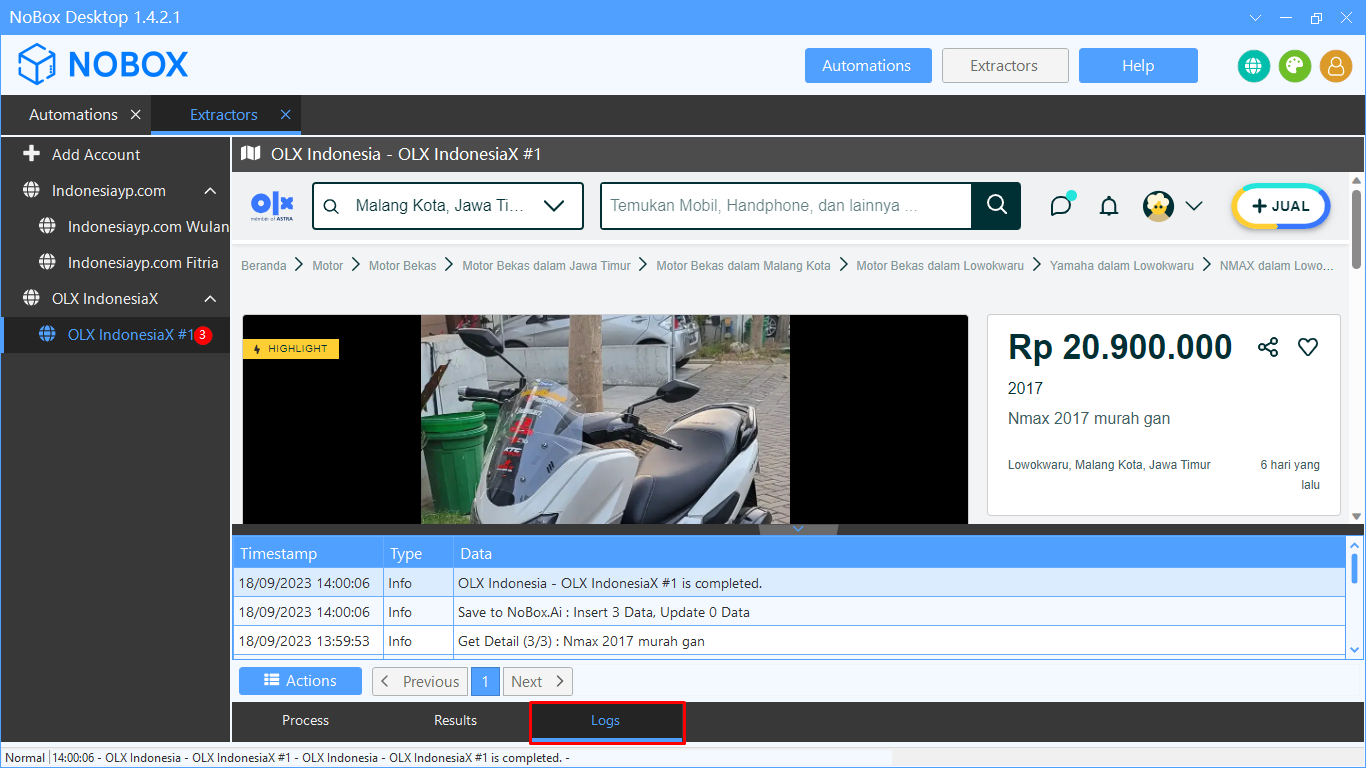 - Extract data from one account using the tool with the search term “Laptop” located in “Jawa Timur.” Retrieve two data entries and include them in the Laptop Malang list.
