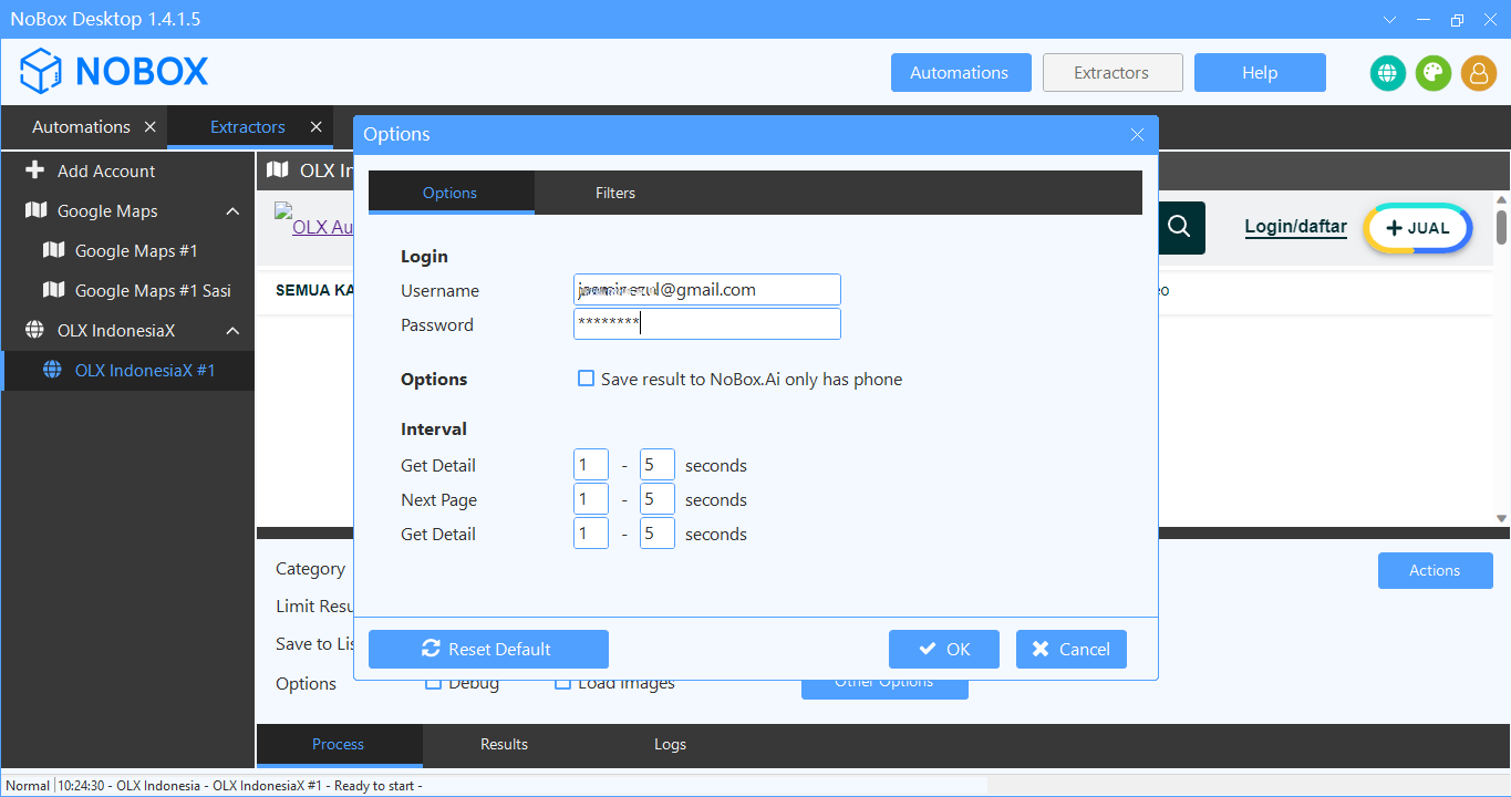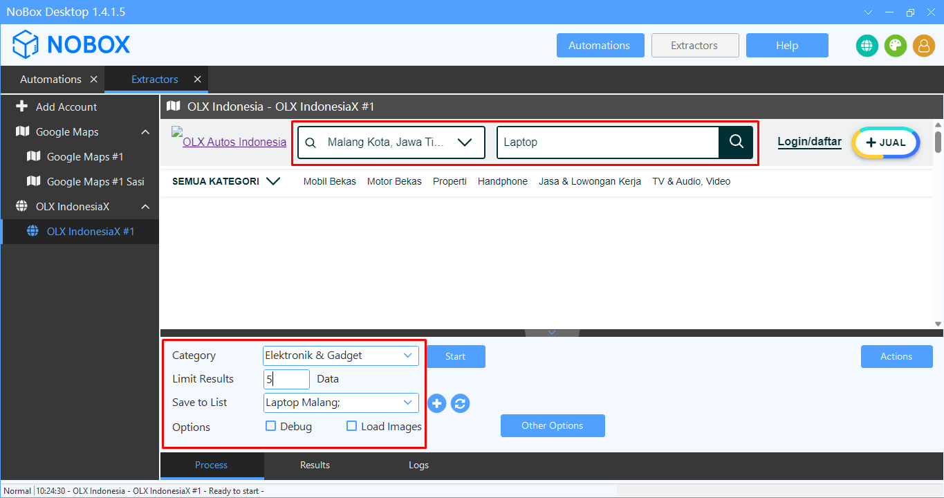 OLX IndonesiaX is a desktop application with Chrome browser support that enables business prospect data (your potential customers) from one network site with the best speed and quality results from various countries. This software extracts various available data from OLX, including links, business names, addresses, phone numbers, websites, ratings, total views, opening hours, image links, latitude, longitude, plus codes, and business fields. Data is automatically saved in NoBox.Ai. You can also export the data in Excel (.xlsx, .csv) and JSON (.json) file formats.