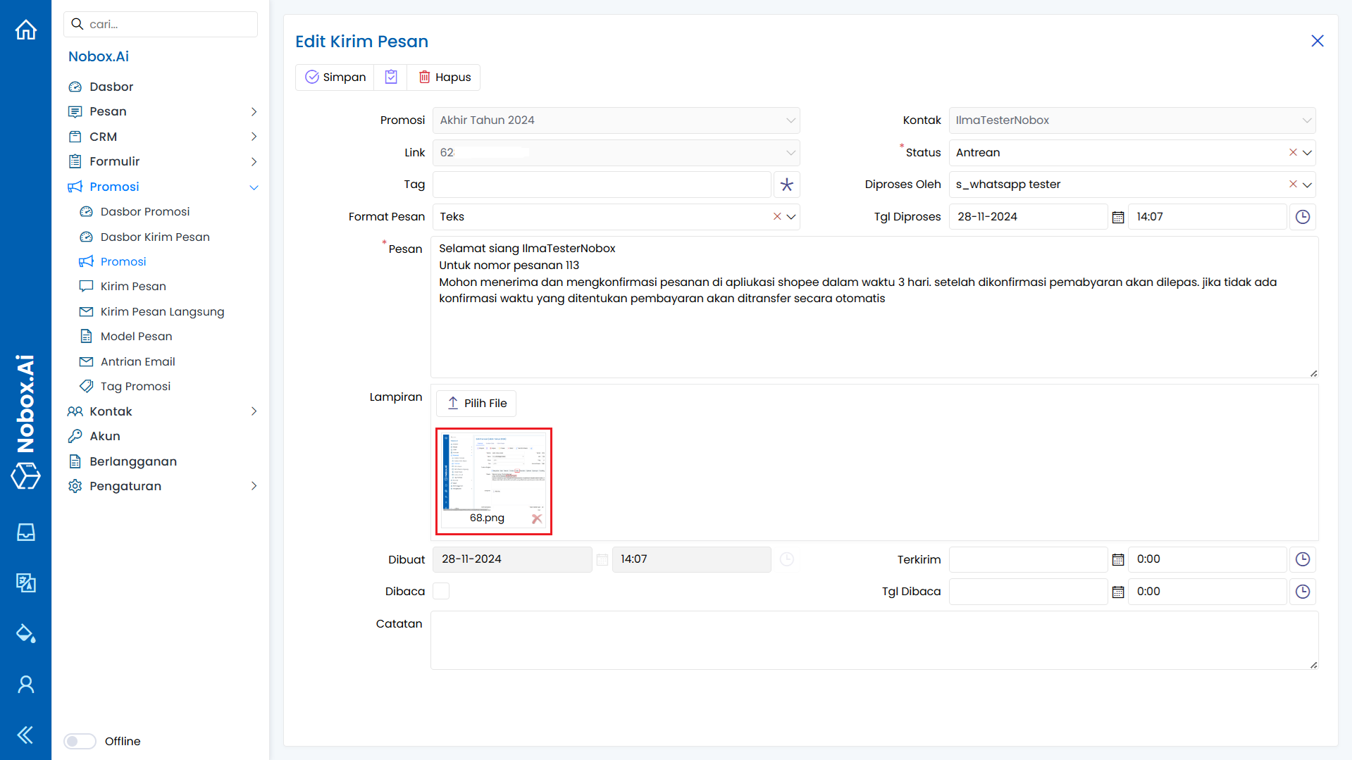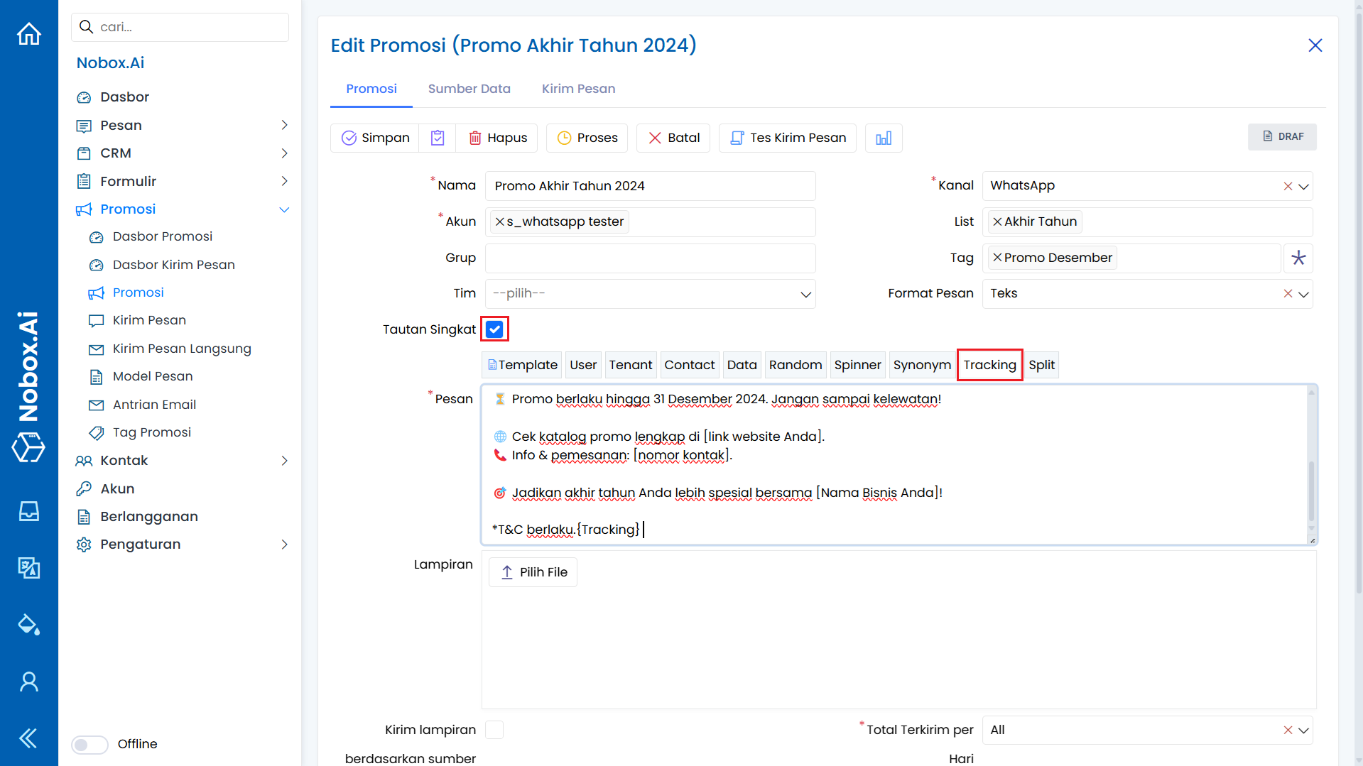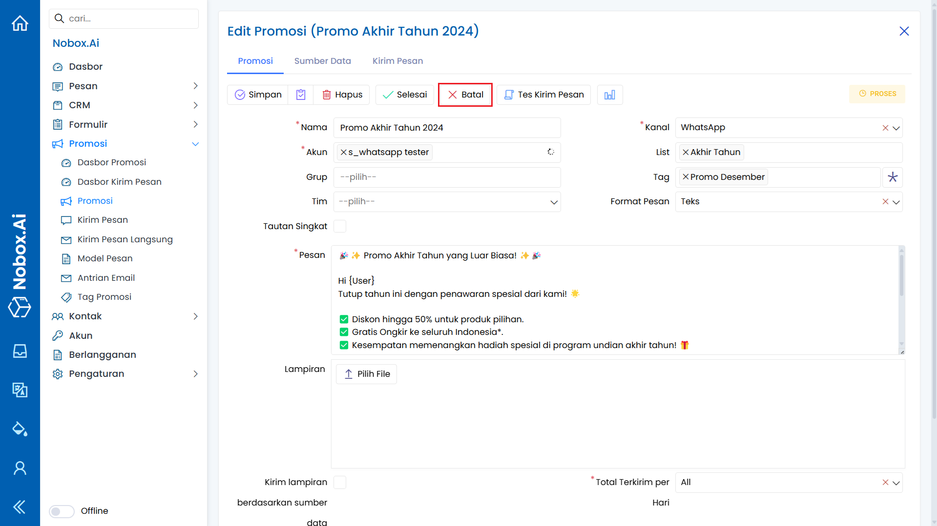 Promotion is one of the menus on Nobox.Ai to carry out promotions easily and efficiently to target promotions by interacting with various channels such as WhatsApp, Telegram, etc