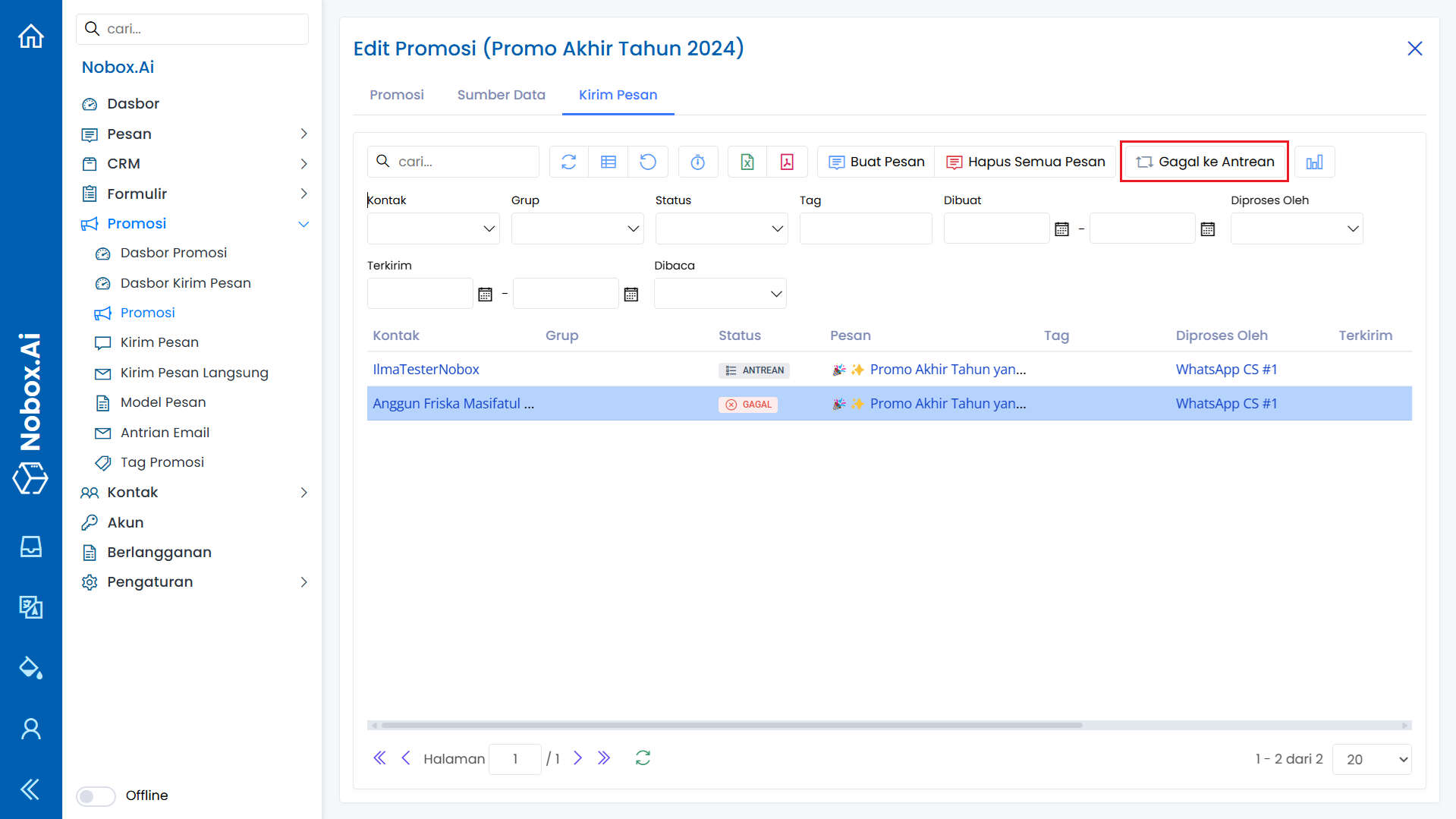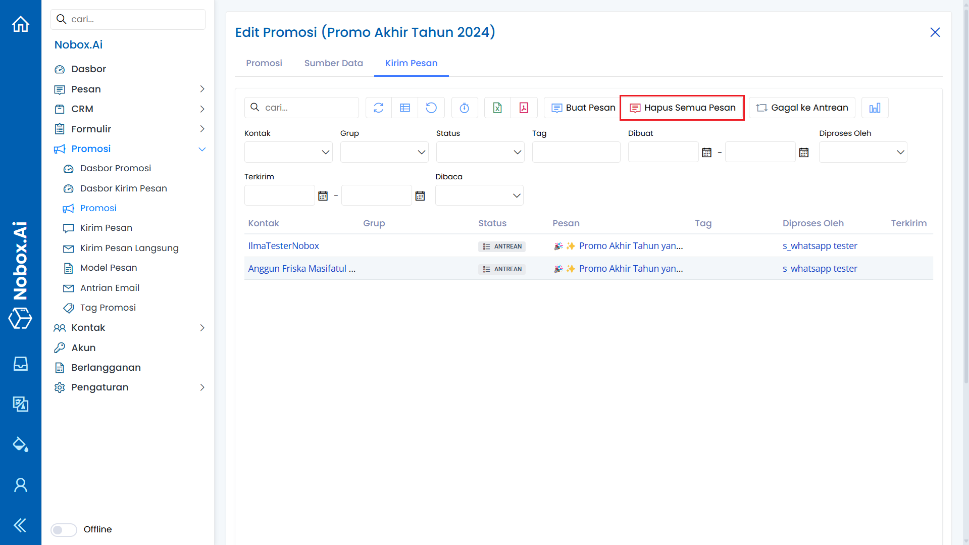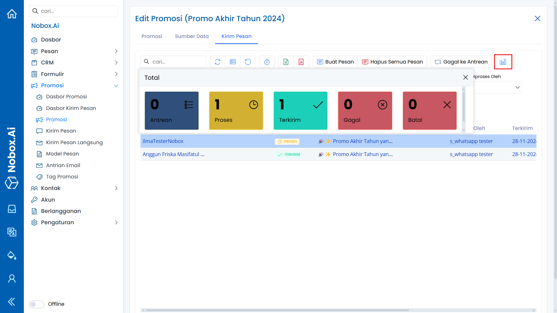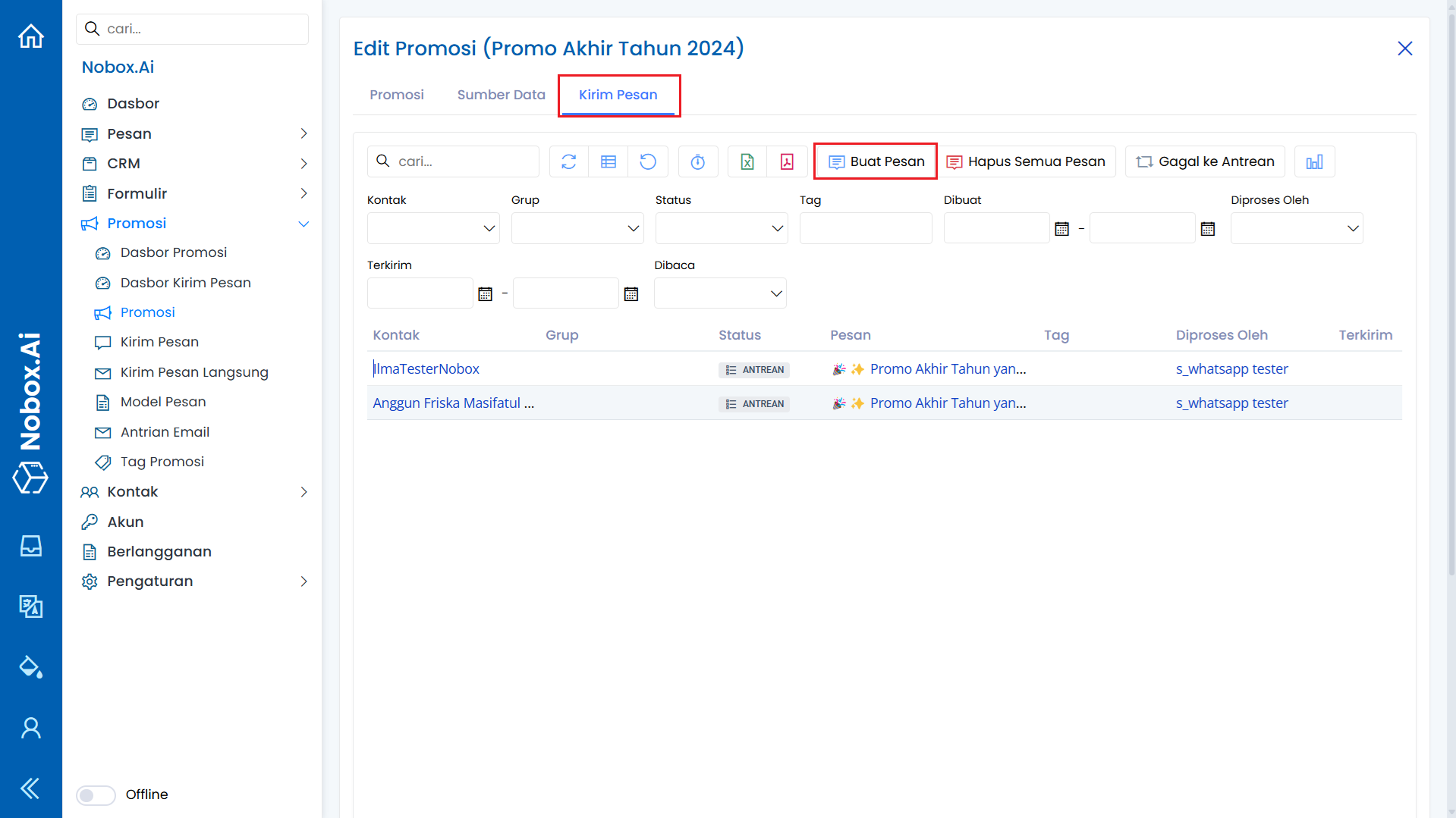 Untuk memonitoring pengiriman promosi Anda dapat membuka tab [Kirim Pesan].