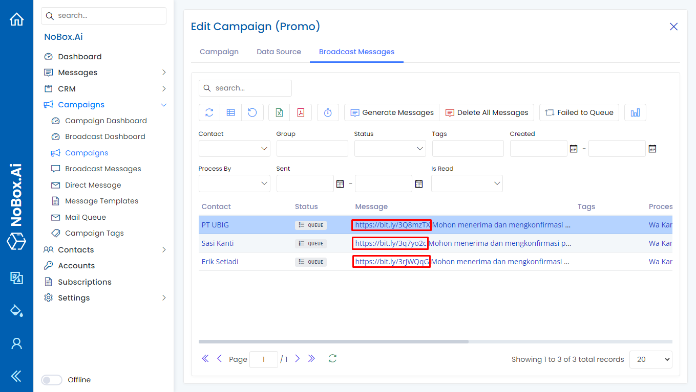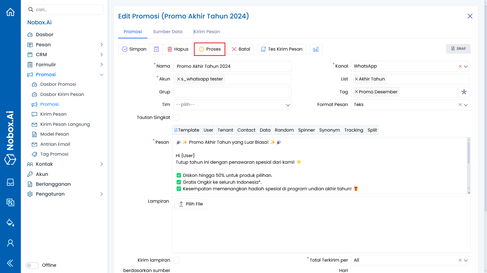 Saat memproses data promosi, Anda bisa [Buat Pesan] dahulu lalu klik [Proses] atau langsung klik [Proses] maka akan otomatis membuat pesan promosi dan langsung proses kirim pesan. Untuk status promosi akan berubah menjadi [Process].