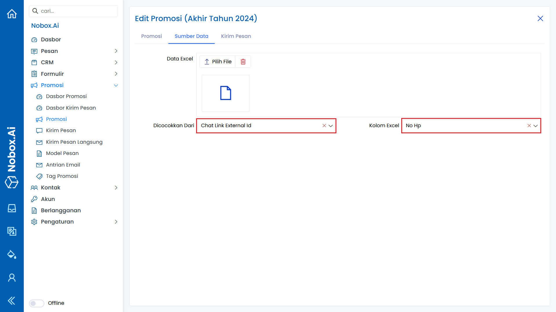 1. Upload file excel pada tab [Sumber Data] pastikan pada file excel tersebut terdapat data kolom yang isinya sama dengan data external id link.