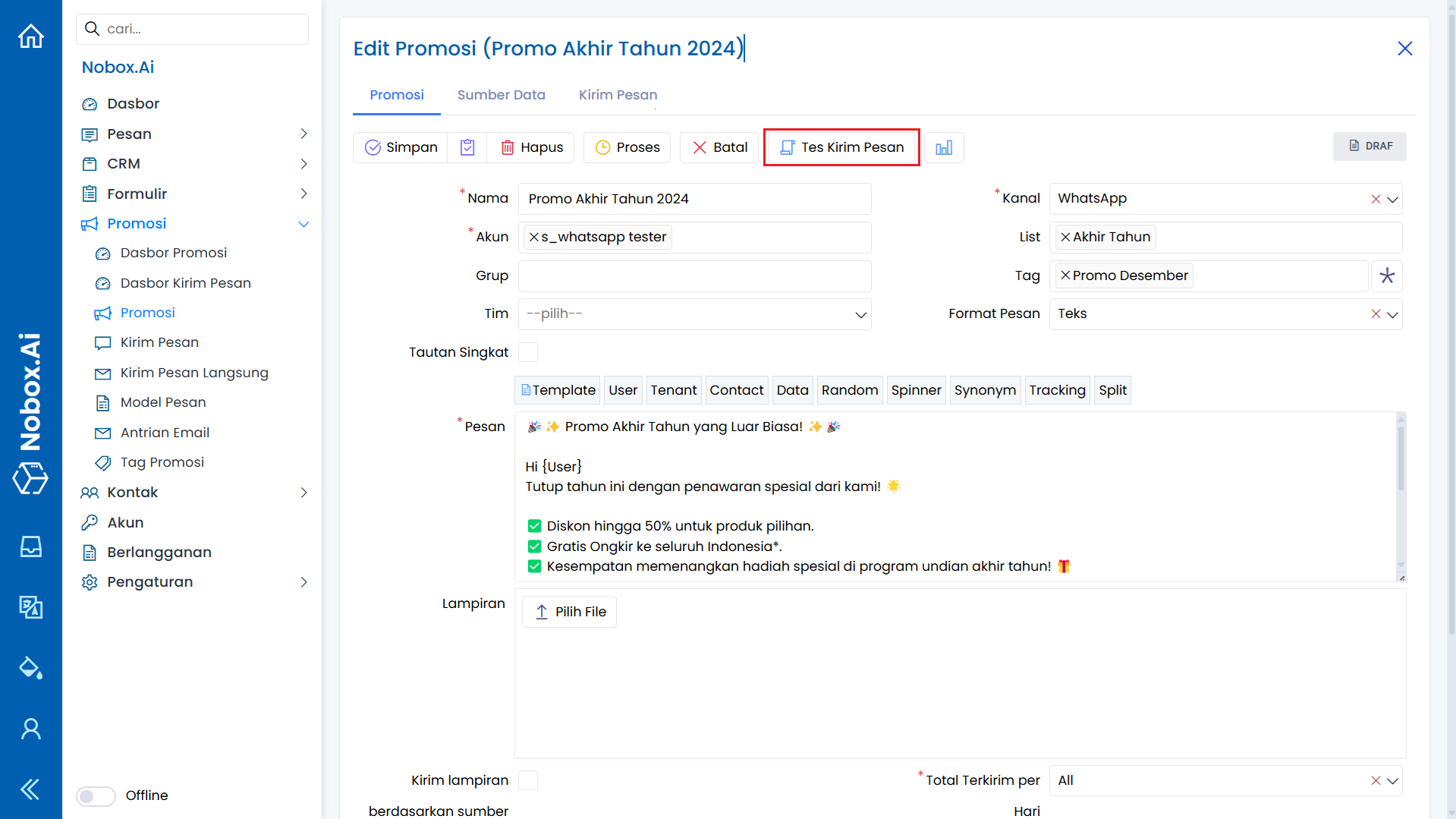 Setelah Anda membuat data promosi, selanjutnya Anda dapat test promosi tersebut untuk cek sudah sesuai atau belum. Silahkan klik tombol [Tes Kirim Pesan] maka data tersebut akan terkirim ke nomor atau email Anda.