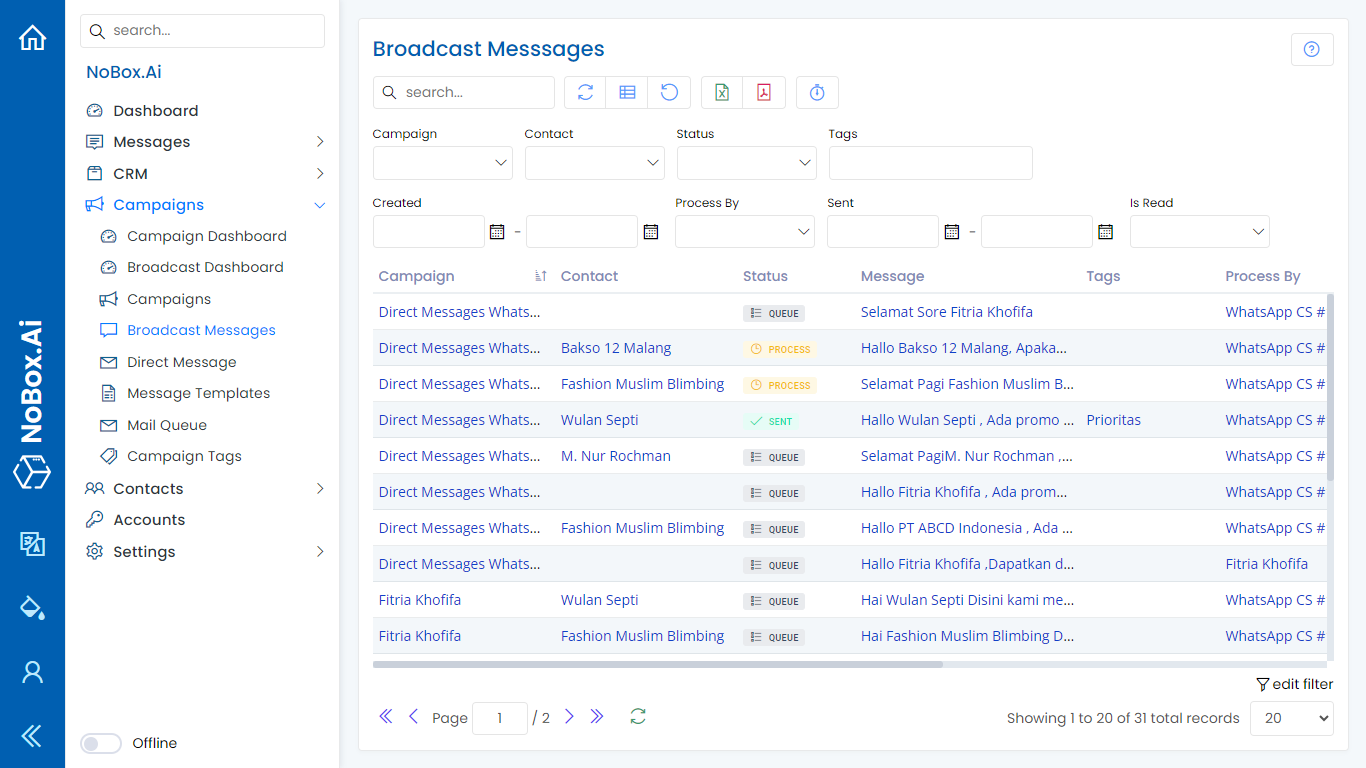 The "Send Message" feature in Nobox.Ai is used for monitoring the results of message sending from all promotional data. It allows you to track messages that are still queued, in process, failed, or successfully sent.