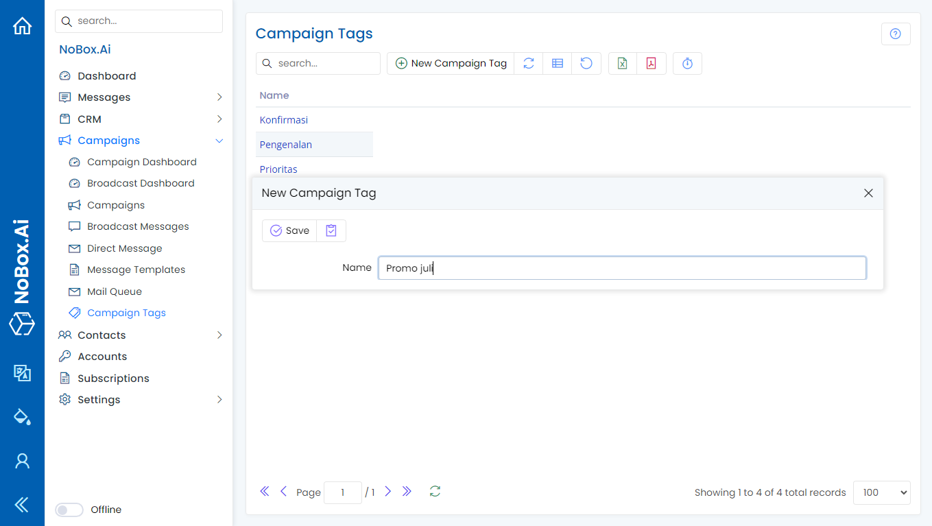 To create a promotion tag, click the [Campaign] module, then select the [Campaign Tag] menu ➔ [New Campaign Tag]. A [New Campaign Tag] dialog will appear; enter the tag name in that dialog.
