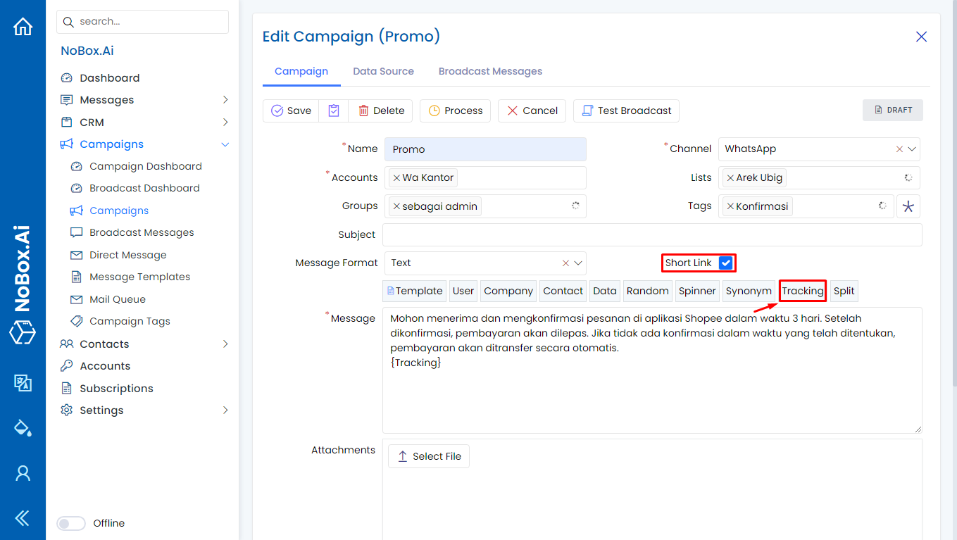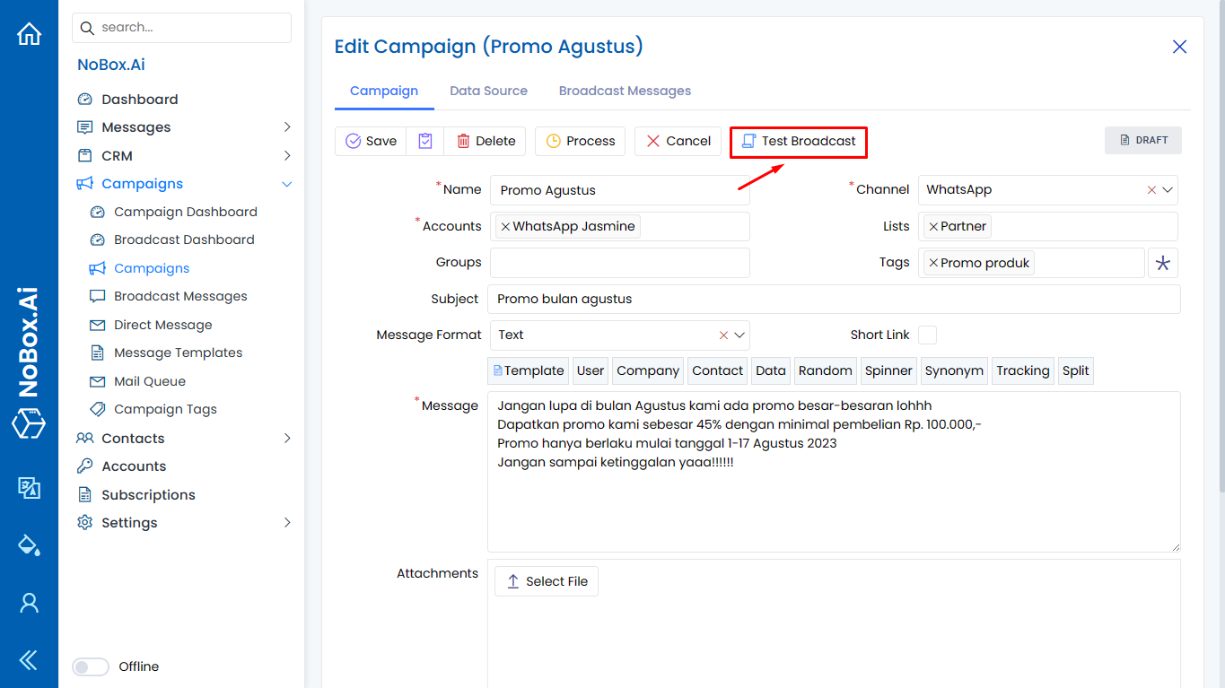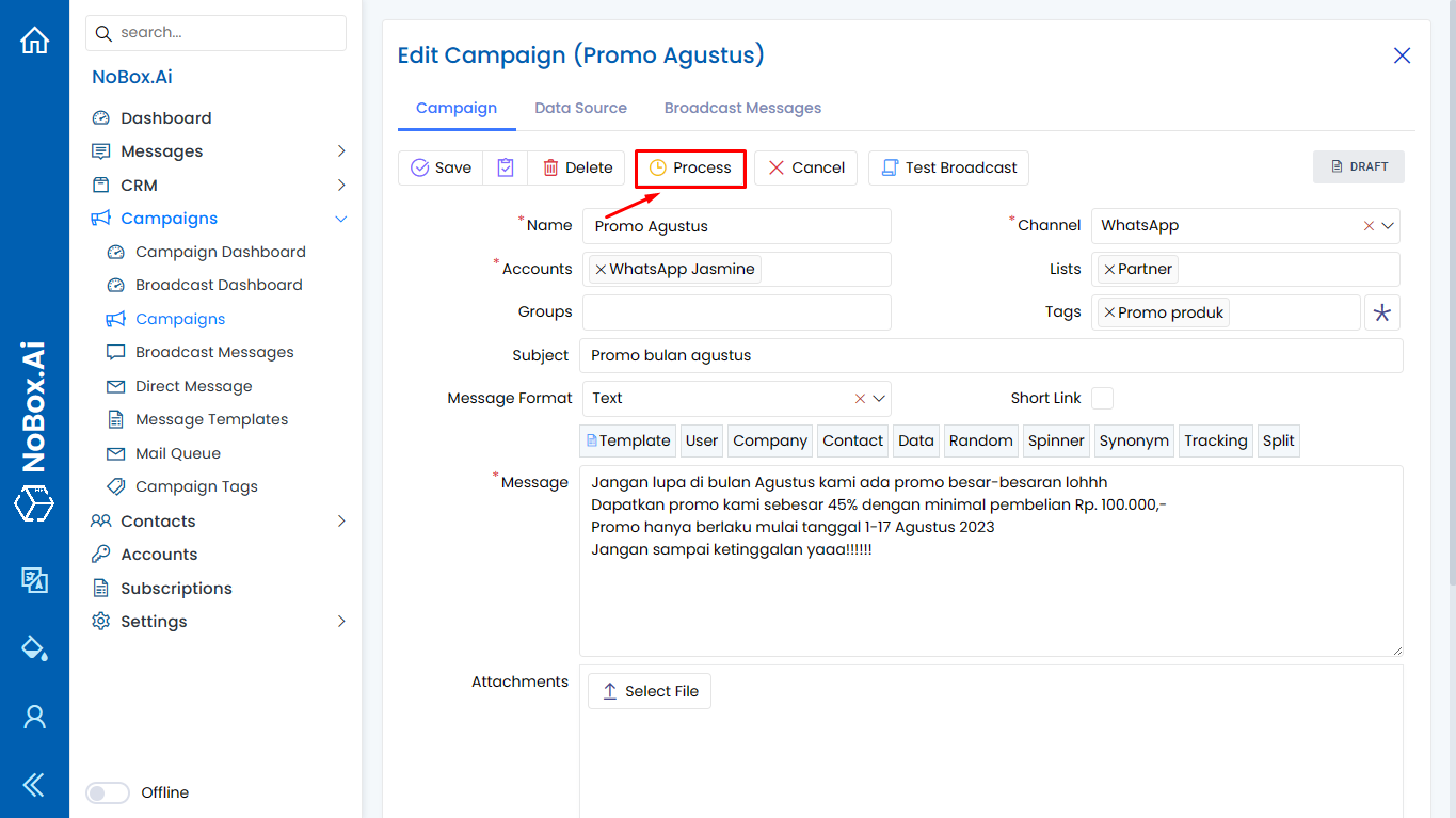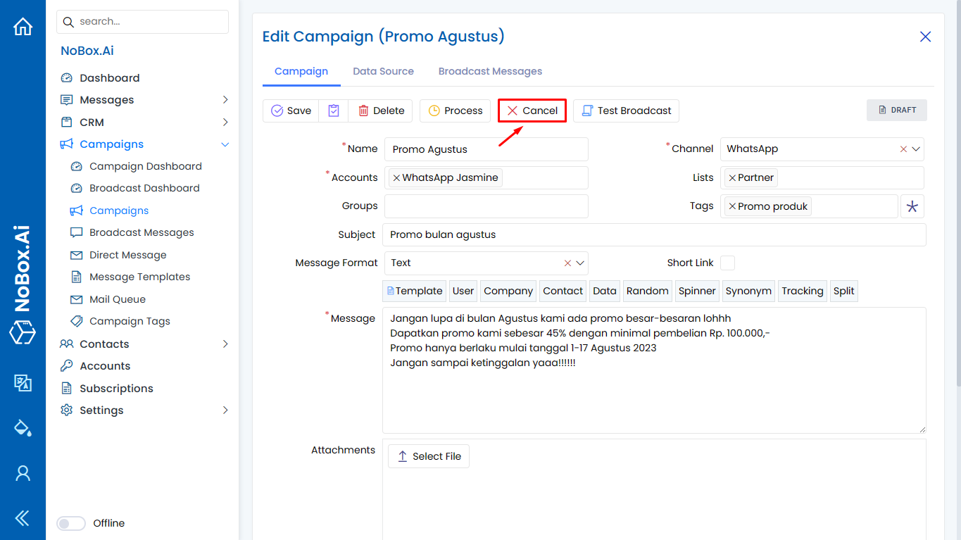Promotion is one of the features in Nobox.Ai that allows for easy and efficient promotion to target audiences. It is integrated with various channels such as WhatsApp, Telegram, etc.