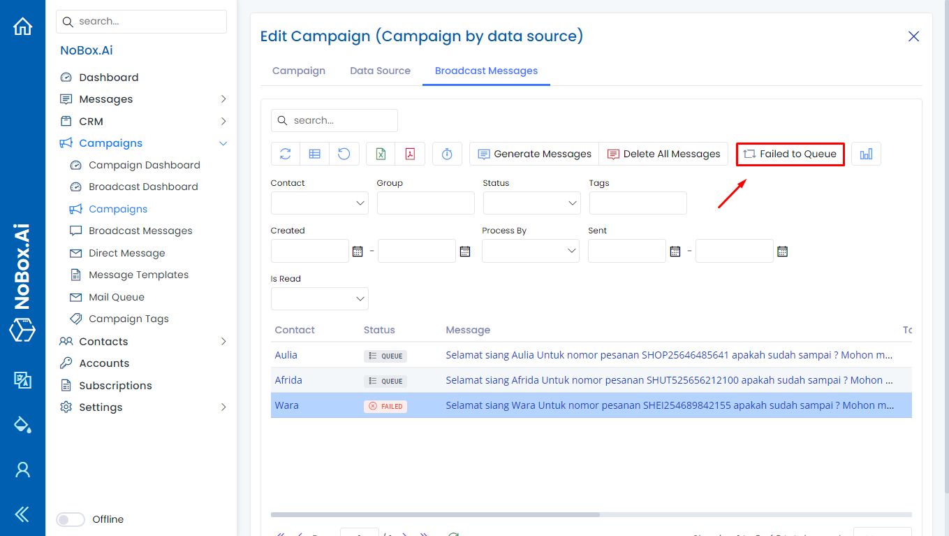 After the Send Message Test is successful, you can proceed to Create Message to see if the broadcast message results match the number of contacts. To Create Message, please click on the [Send Message]➔[Create Message] tab, then the broadcast message data will be displayed according to the selected contact list.