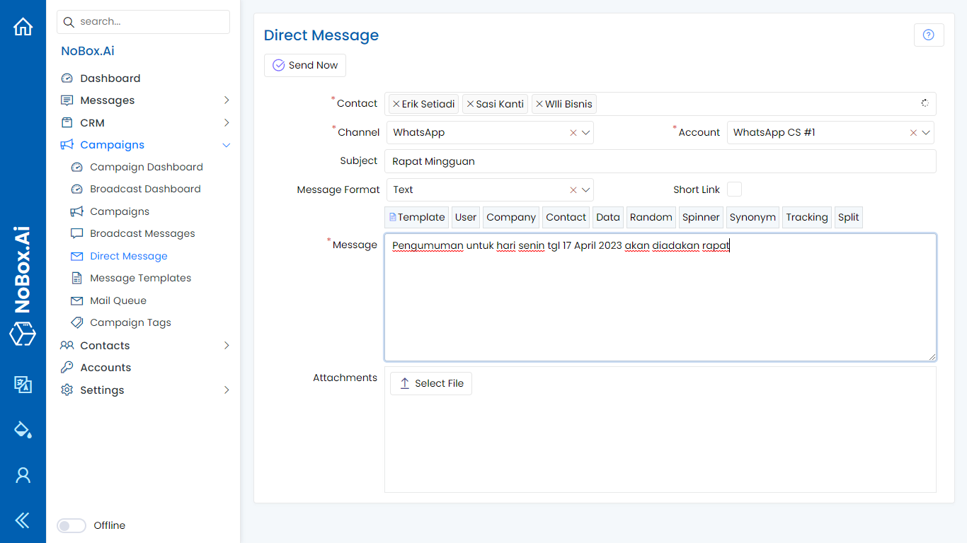 The Direct Message feature is part of Nobox.Ai, used for sending messages directly to one or more contacts.