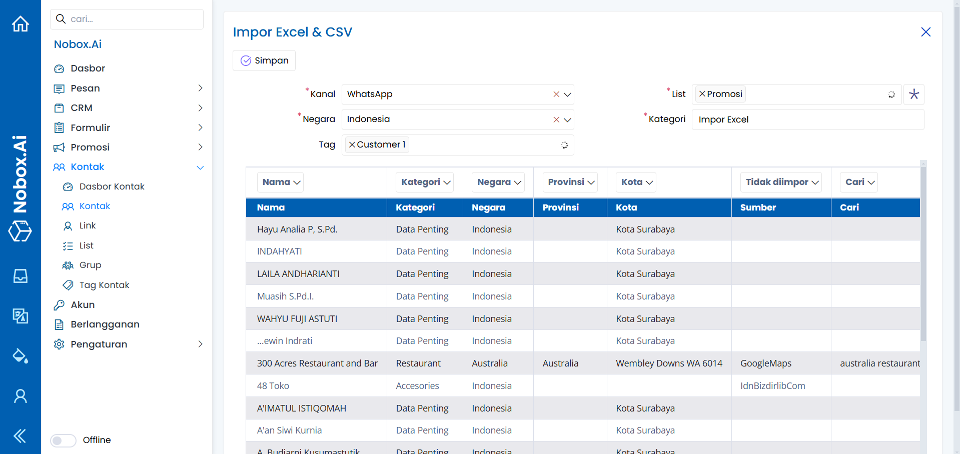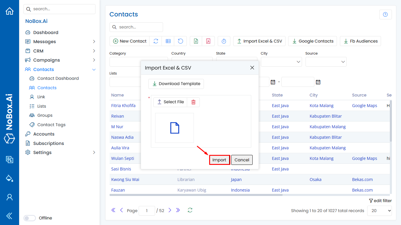 • Import Excel & CSV: Used to import contact data in Excel or CSV format from a file you own into your Nobox.Ai contact data.
