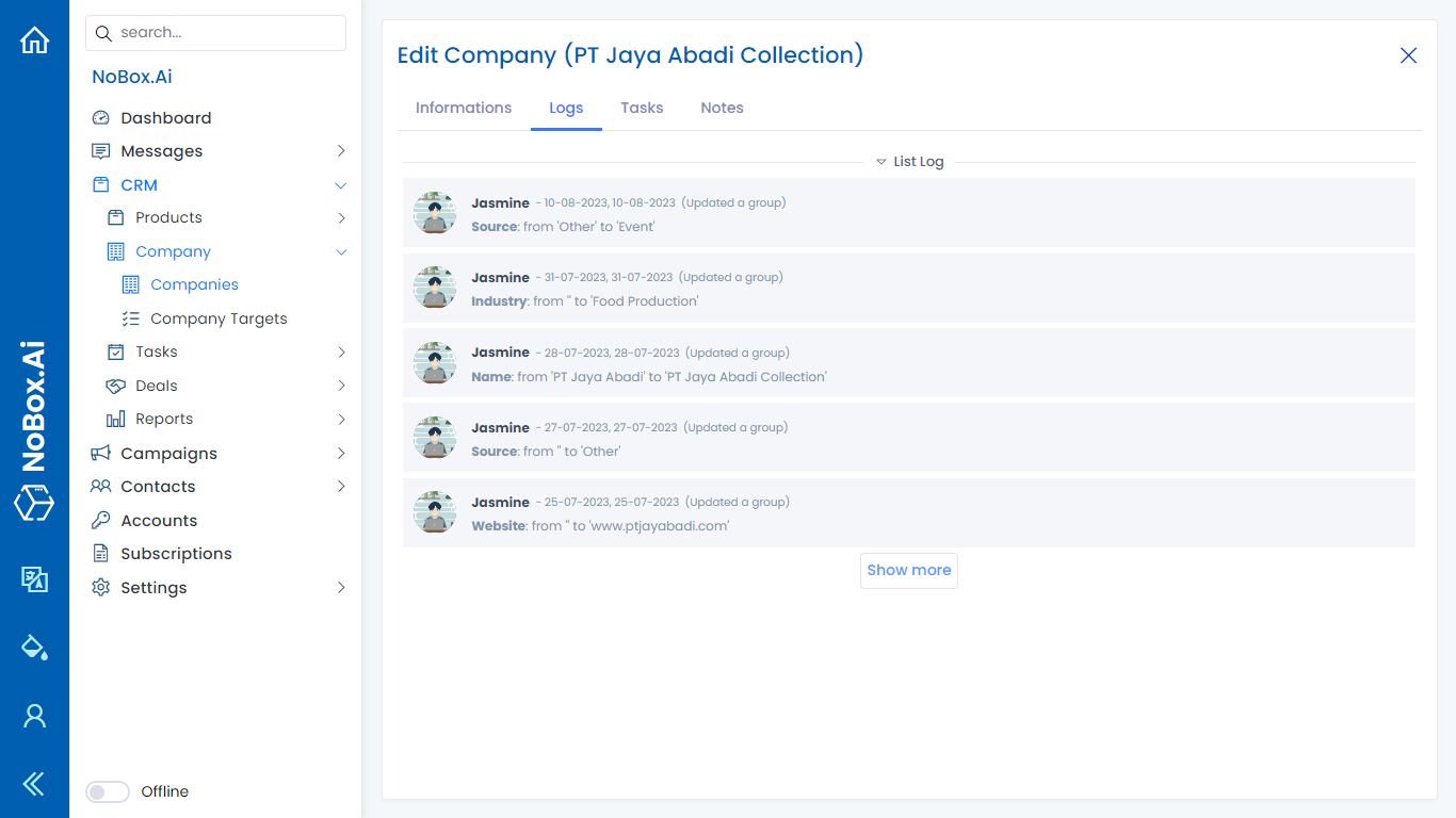 Log is one of the features of NoBox.Ai that provides information on activities related to the company.