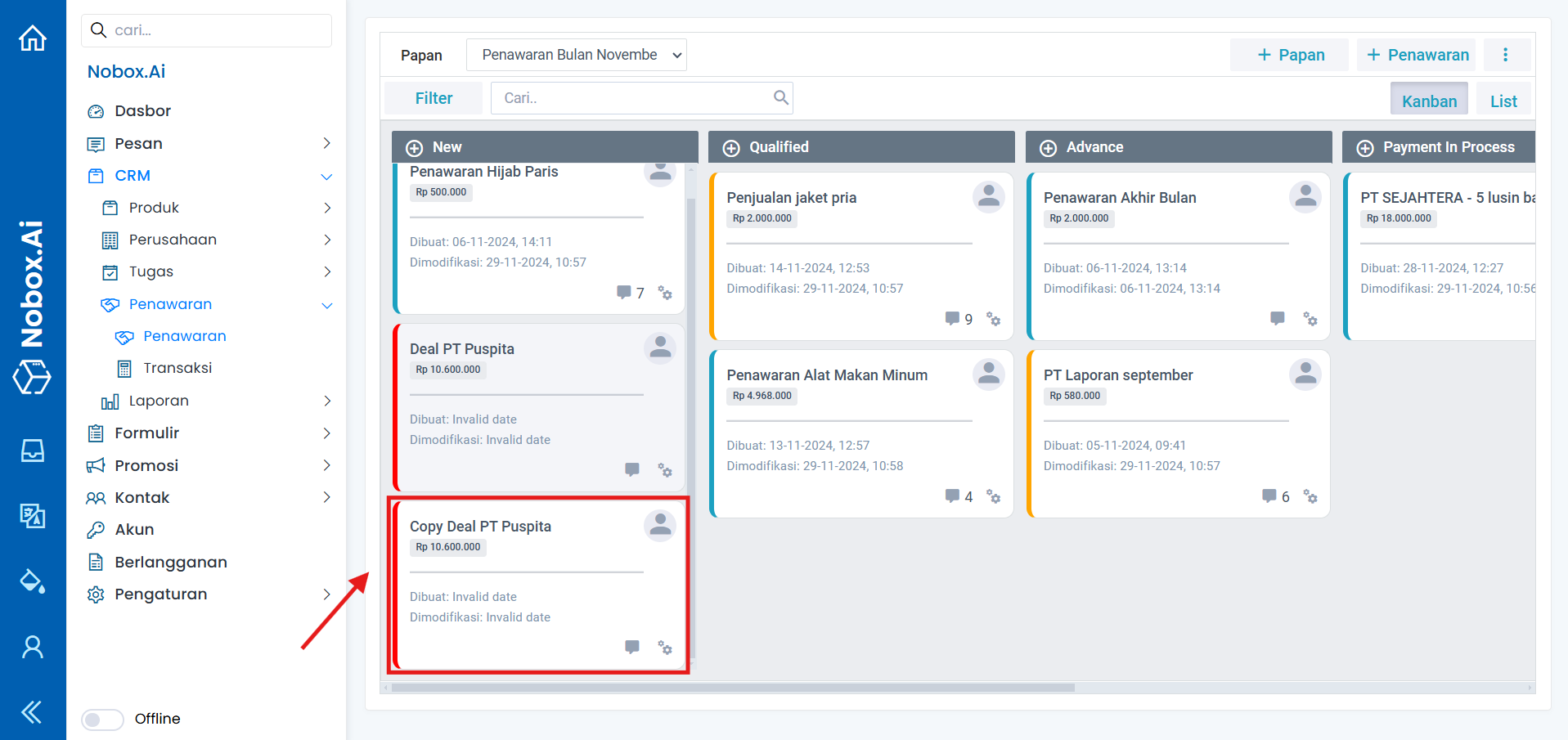 Deals is one of the menus in Nobox.Ai used for managing offers, making it easier for you to manage all information and activities related to sales progress.