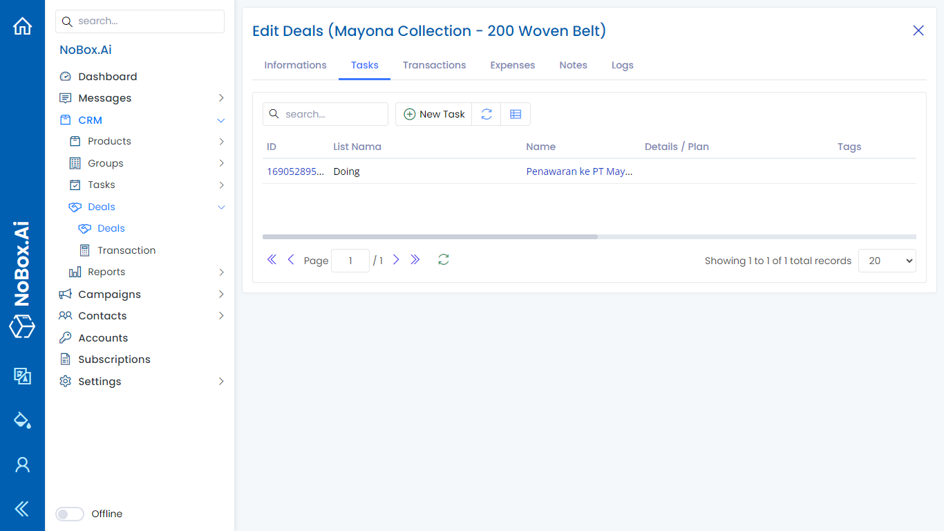 Transactions are a feature of Nobox.Ai used to record payment-related transactions with the respective offers.
