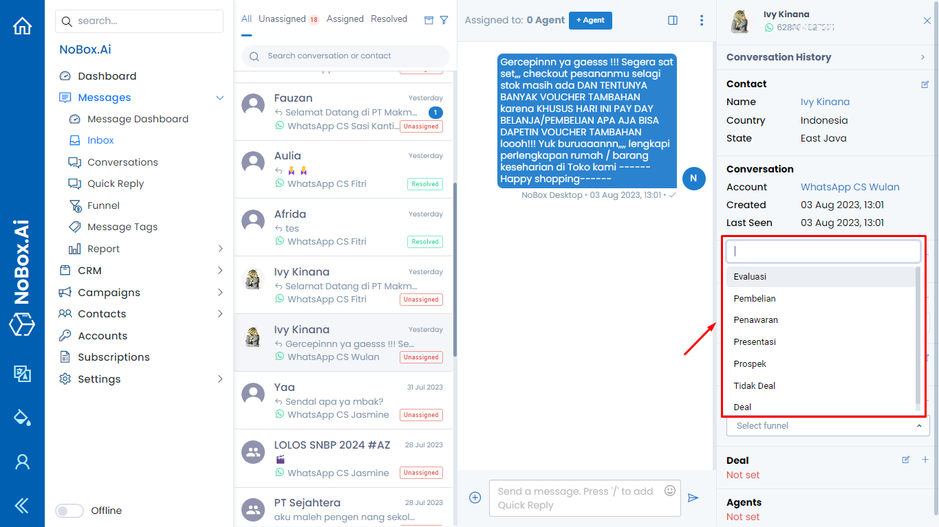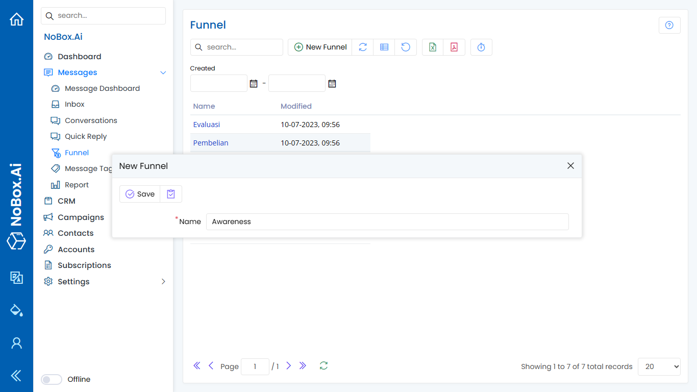 Funnel is a feature in Nobox.Ai used to categorize stages in marketing and support processes.