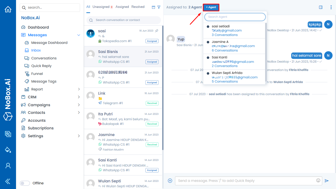 On the Inbox page, a supervisor can allocate customers to available agents. To add an agent, please click the [+ Agent] button, and a list of available agents will appear. Click an agent's name to select that agent.