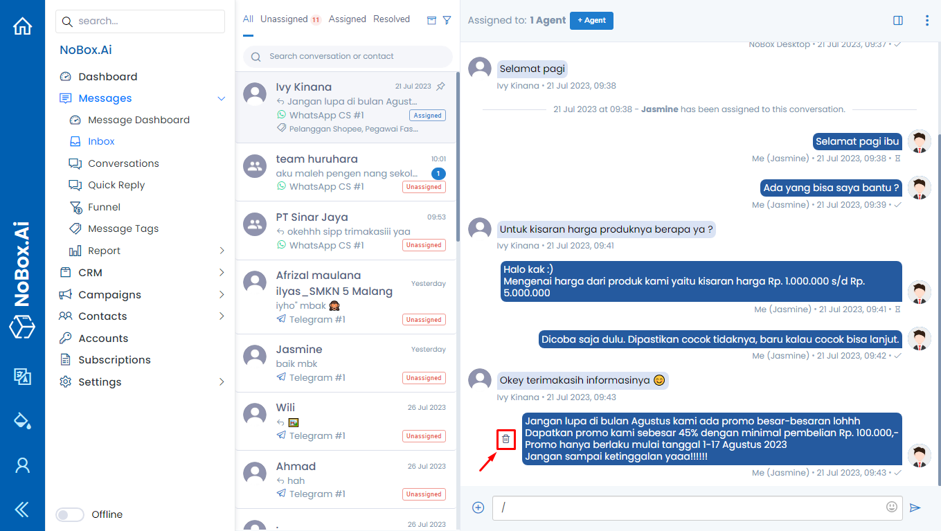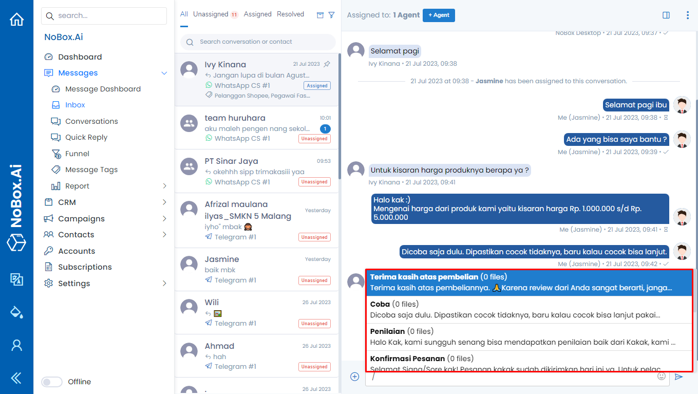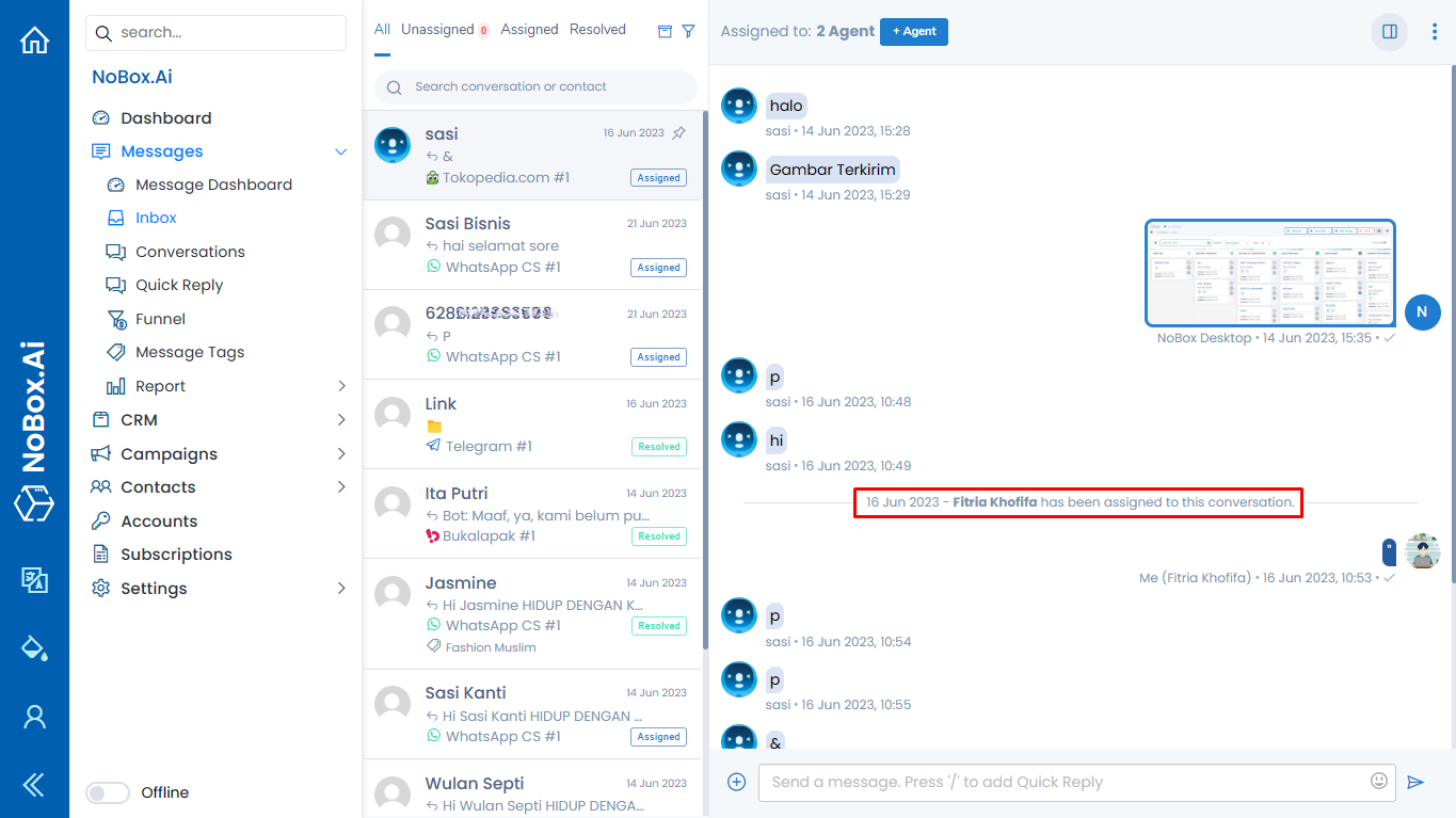 Inbox is one of the NoBox.Ai features used to manage all incoming messages from various channels such as WhatsApp, Telegram, Shopee, etc.