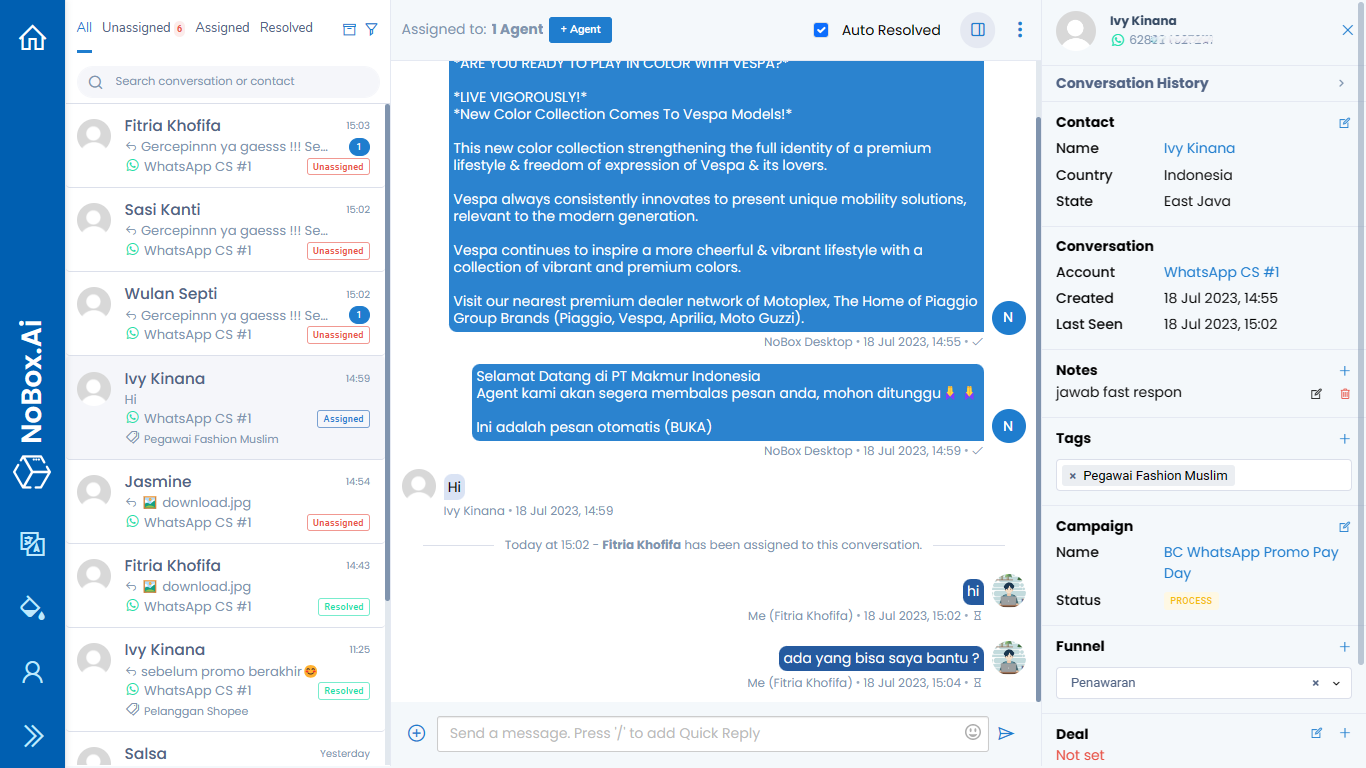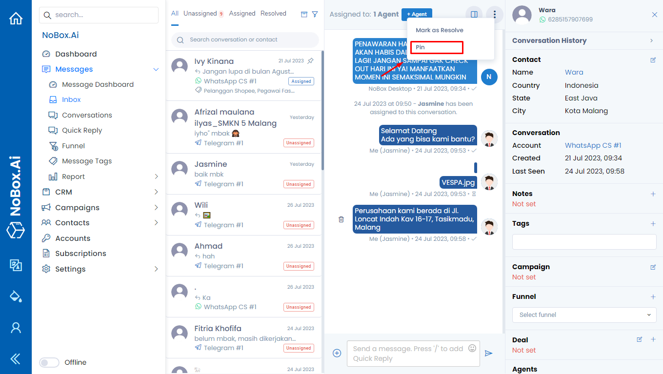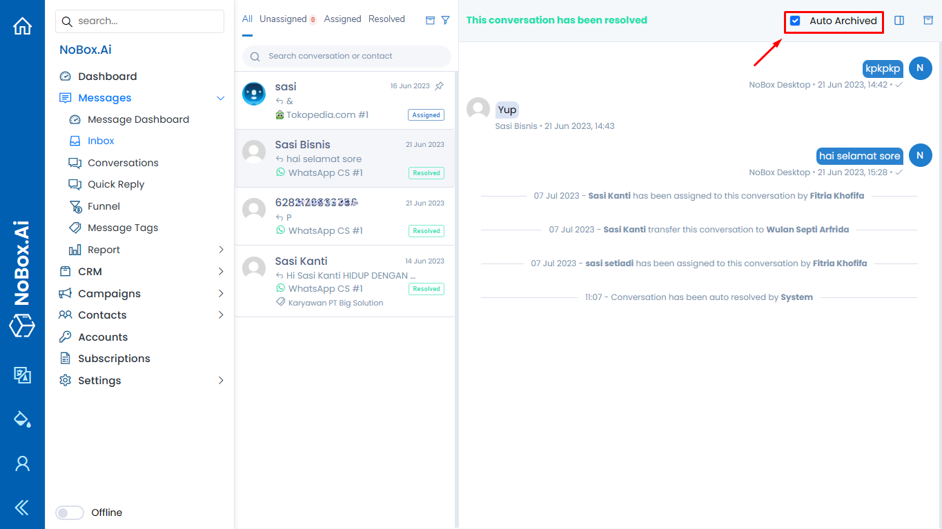 Inbox is one of the NoBox.Ai features used to manage all incoming messages from various channels such as WhatsApp, Telegram, Shopee, etc.