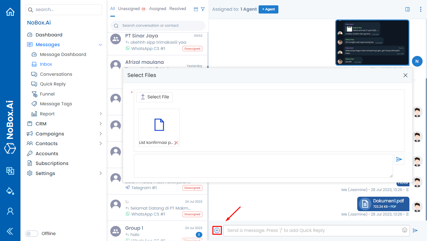 In the Inbox page, there is a feature to send files such as images, photos, voice notes, PDFs, Excel, etc. To send a file, please click the icon [
