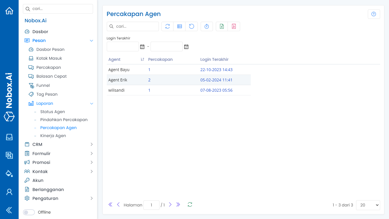 In one of the Nobox.Ai submenus, there is information about which agents have changed their status to online or offline, as well as information on the last time an agent logged in.