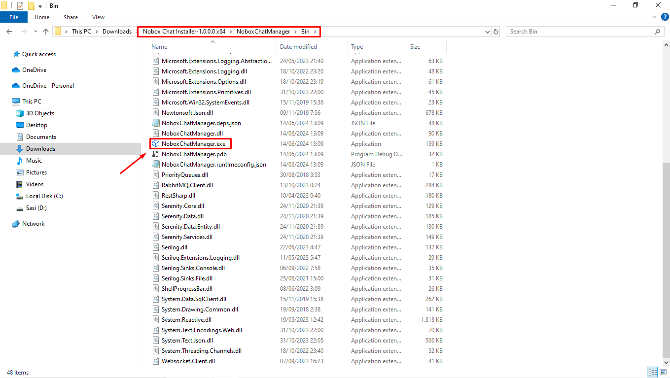 - Navigate to the NoboxChatManager folder, open the folder named [Bin], and run the NoboxChatManager.exe file.