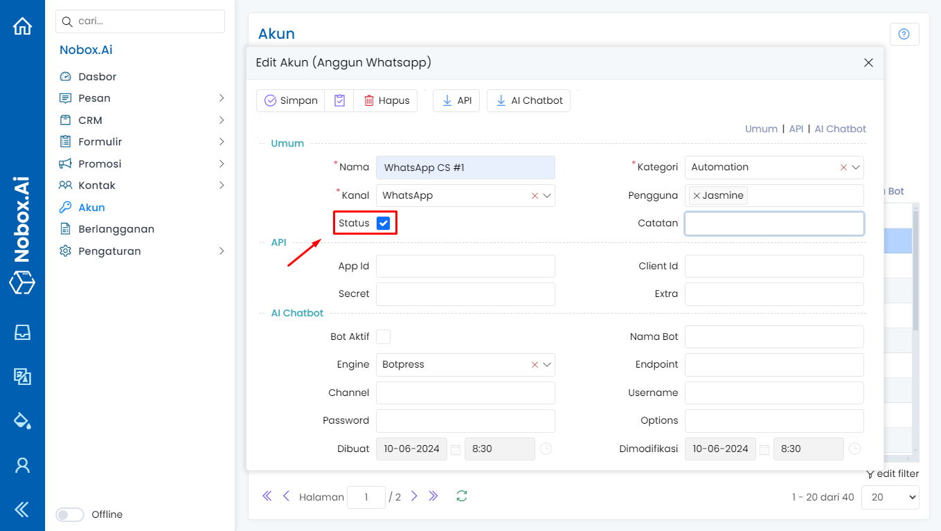 Untuk mengedit suatu akun, silahkan buka dan login website id.nobox.ai, klik menu [Accounts]. Silahkan pilih akun mana yang akan Anda edit, kemudian editlah data Anda dan klik [Save] untuk menyimpan perubahan tersebut.