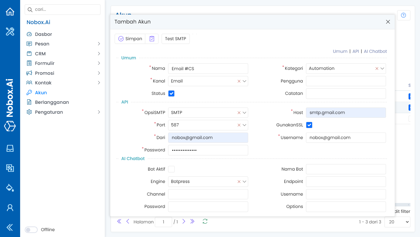 Pastikan Anda sudah berlangganan Email Automation. Untuk menambah akun baru, silahkan menu [Akun] ➔ klik tombol [Tambah akun] ➔ maka akan muncul dialog [Tambah Akun].