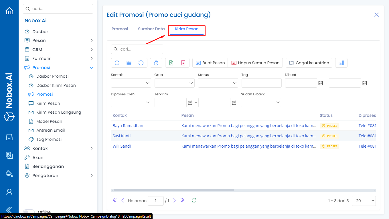 4. Untuk memonitoring pengiriman Promosi, Anda dapat buka tab [Kirim Pesan]