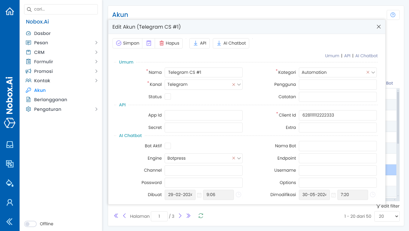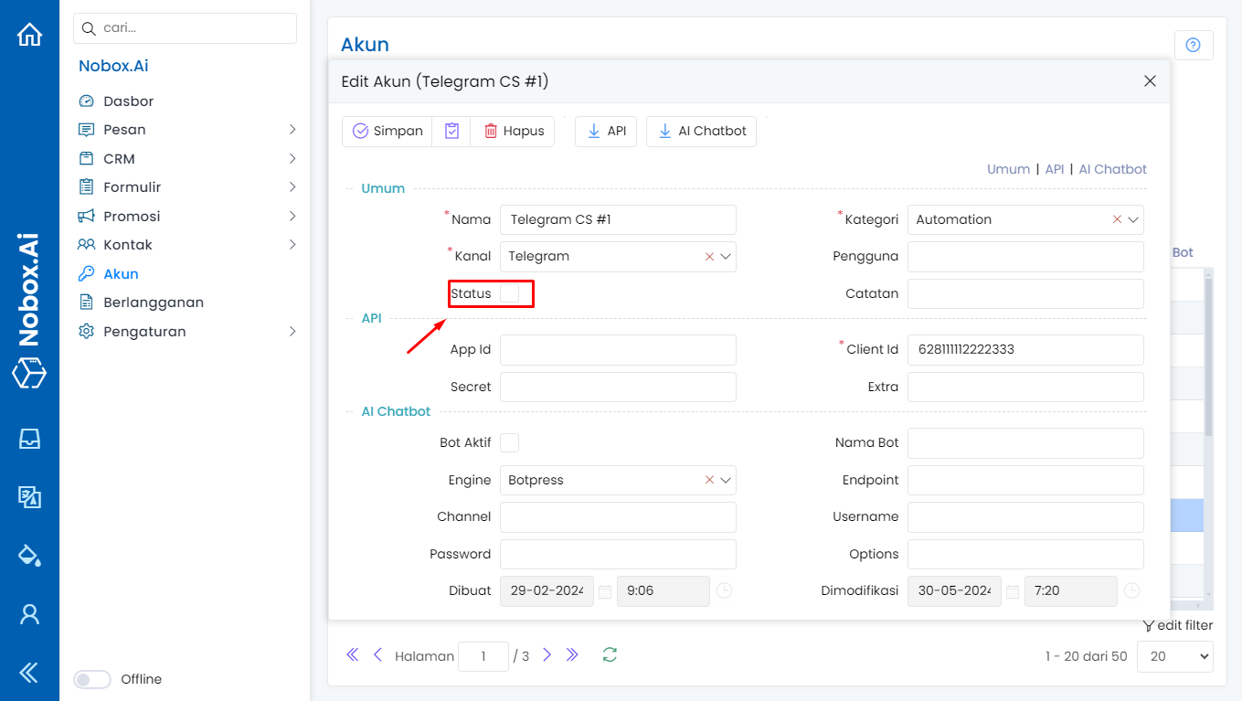 Untuk menonaktifkan akun adalah dengan pilih salah satu akun Telegram Anda, kemudian uncheklist pada bagian status. Jika sudah klik [Simpan] untuk menyimpan perubahan tersebut.
