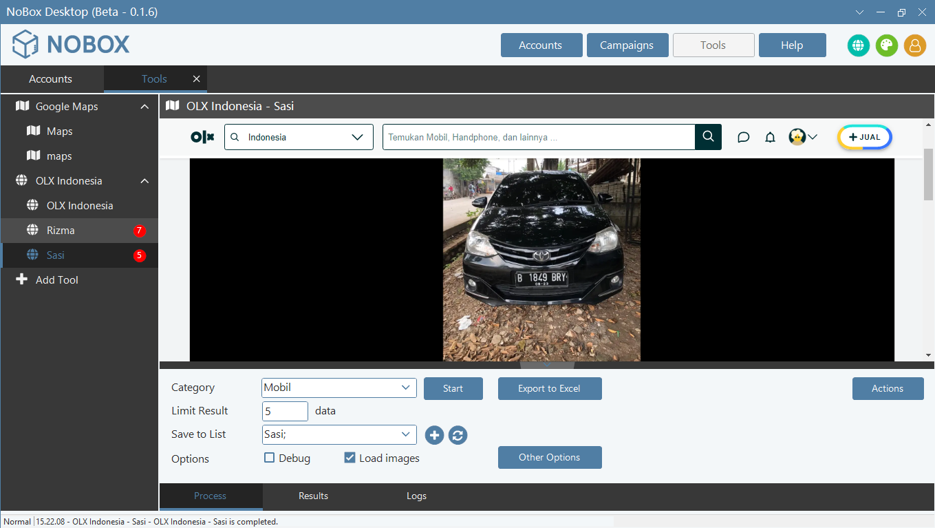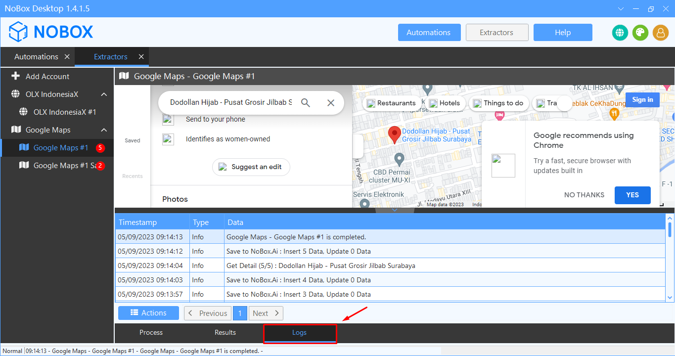 - Buka kembali aplikasi NoBox dan masuk ke menu [Extractor -> Google Maps]. Akan ada pemberitahuan bahwa proses sebelumnya masih belum selesai.