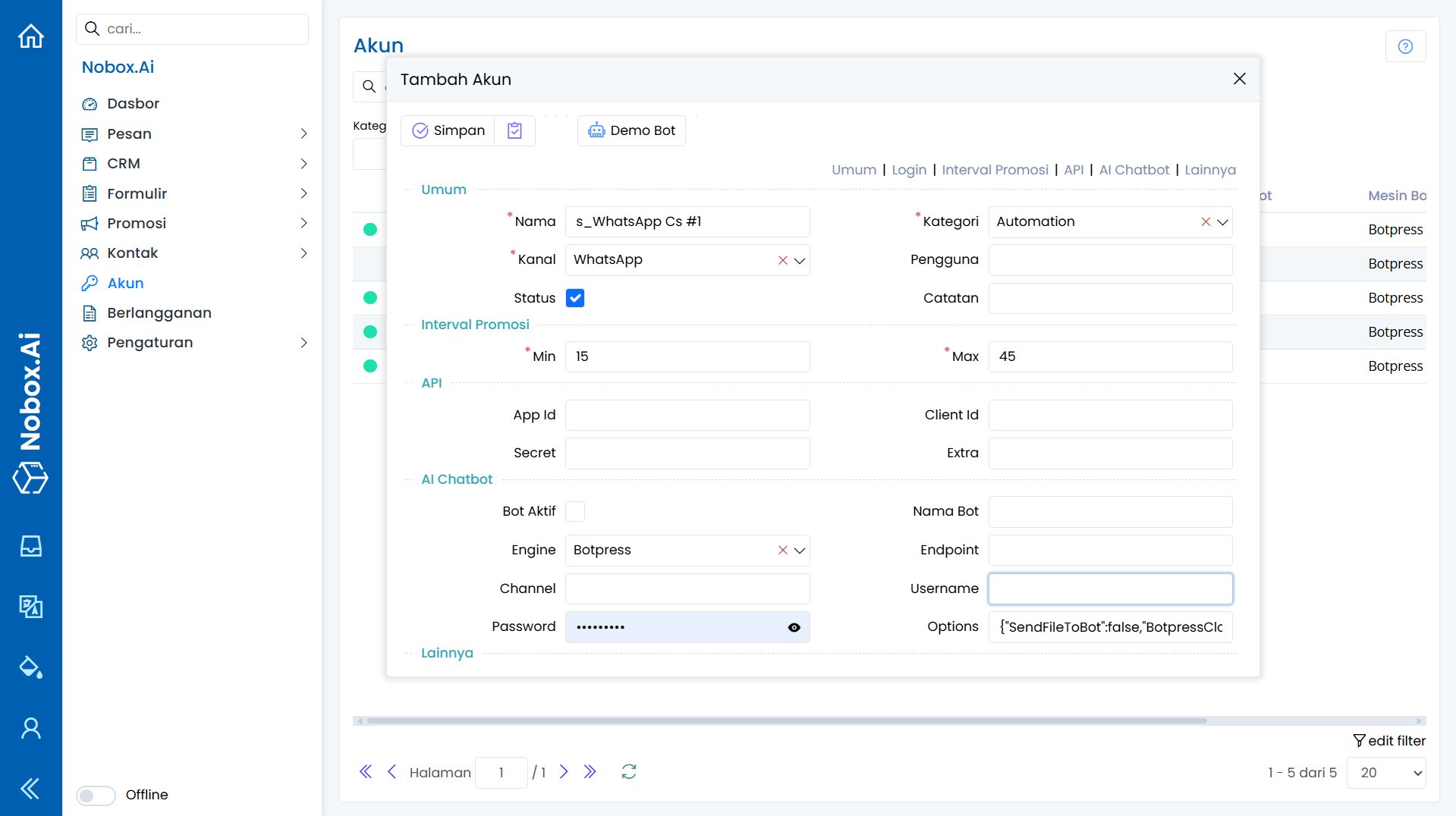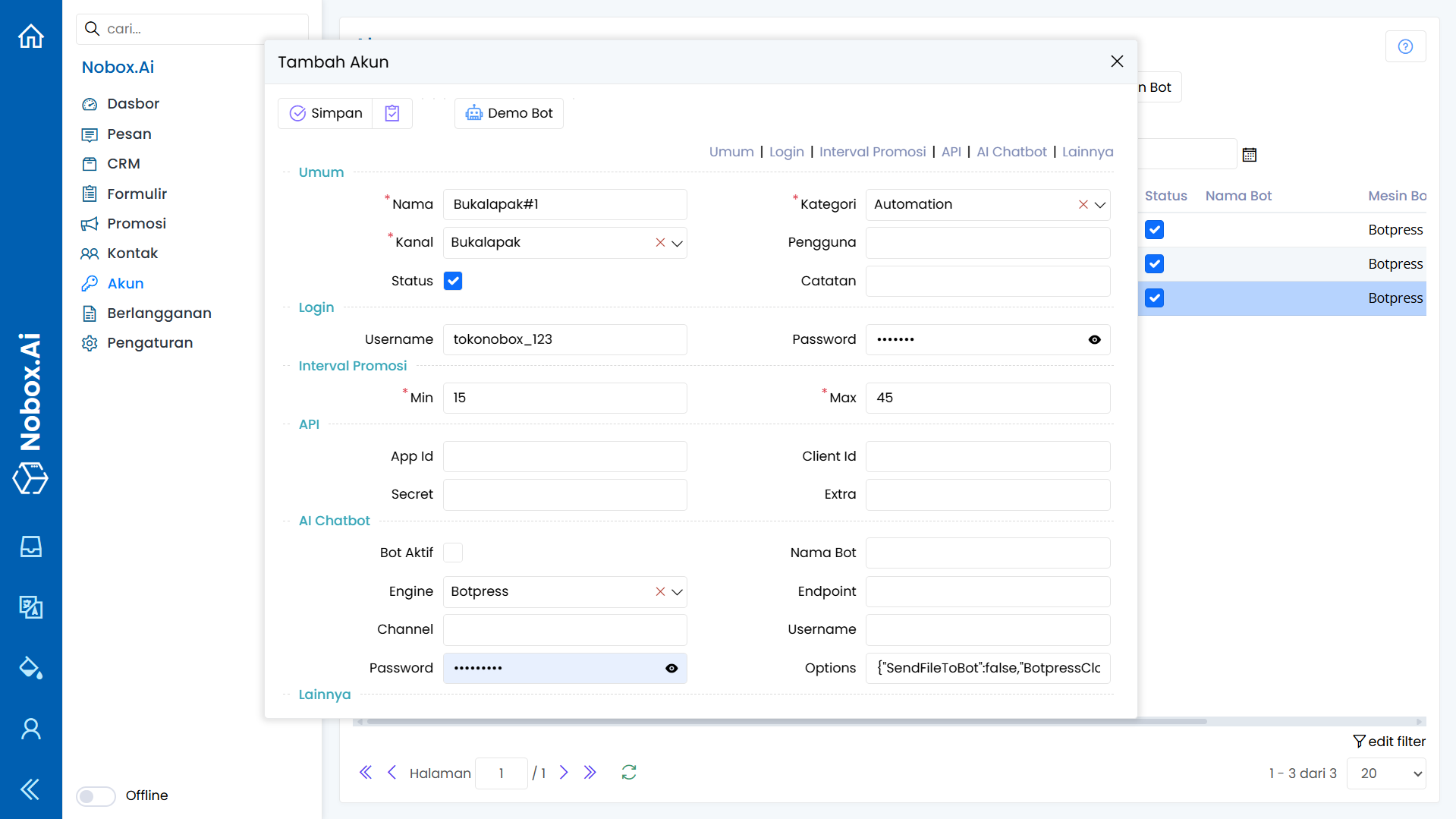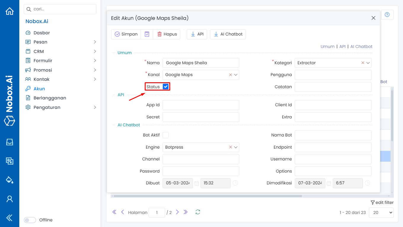 Anda dapat menonaktifkan akun dengan pilih salah satu akun, kemudian hapus tanda centang pada bagian status, fitur tersebut berpengaruh untuk mengurangi pengunaan RAM aplikasi Nobox Desktop pada komputer Anda.