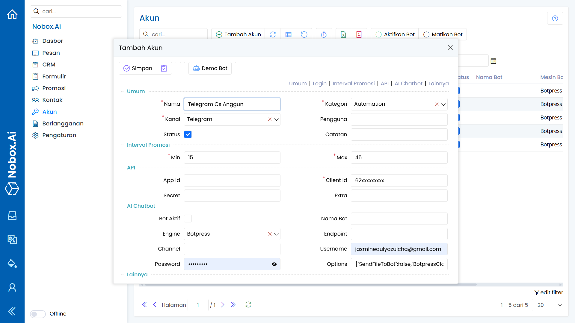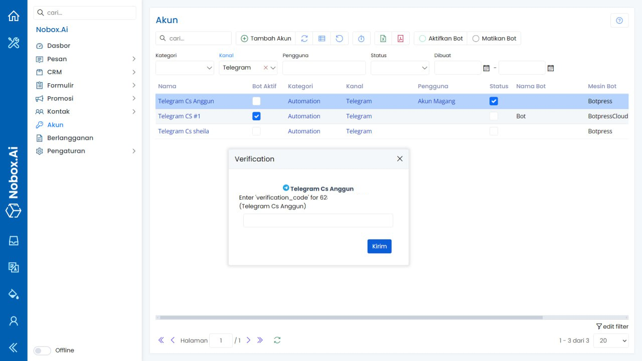 Jika Anda sudah melengkapi isian yang ada, klik [Simpan] untuk menyimpan data akun yang baru saja Anda buat. Silakan tunggu beberapa saat hingga Anda menerima OTP dari Telegram. Pada website Nobox akan tampil dialog OTP. Masukkan kode OTP yang sudah anda terima, klik [Kirim].