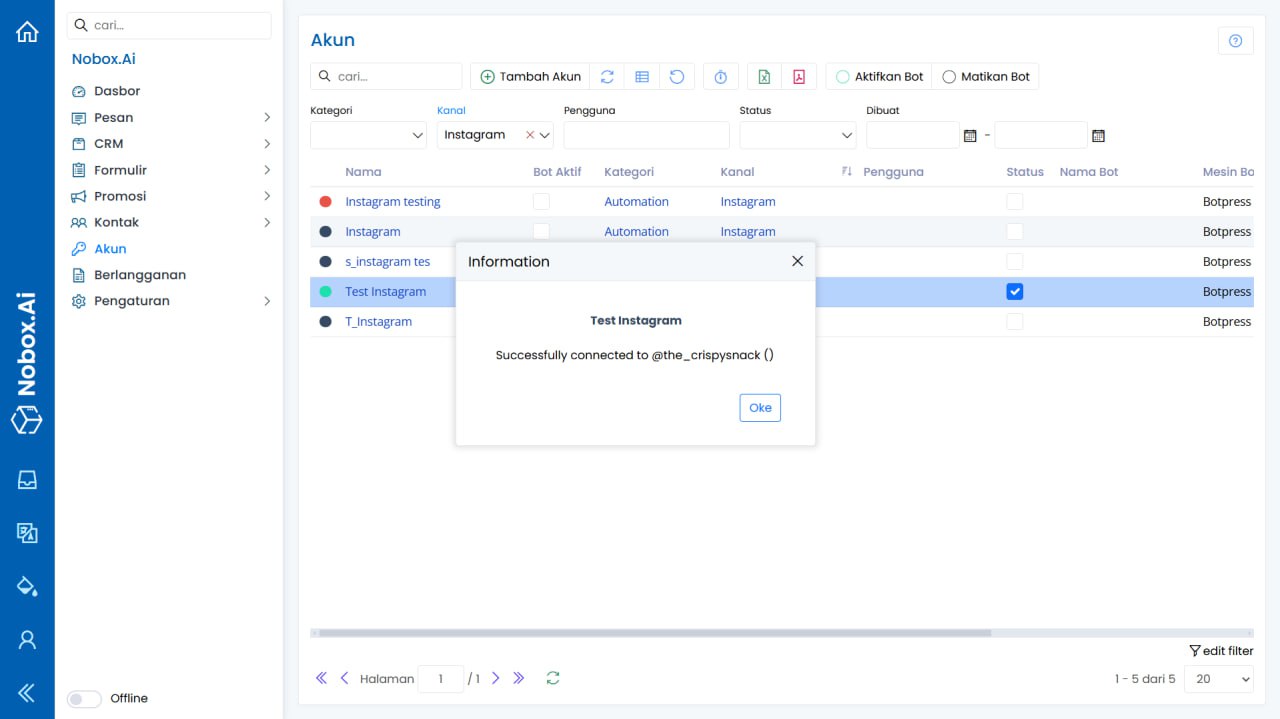 | Nama | Nama akun yang akan dibuat | s_instagram tesNobo |