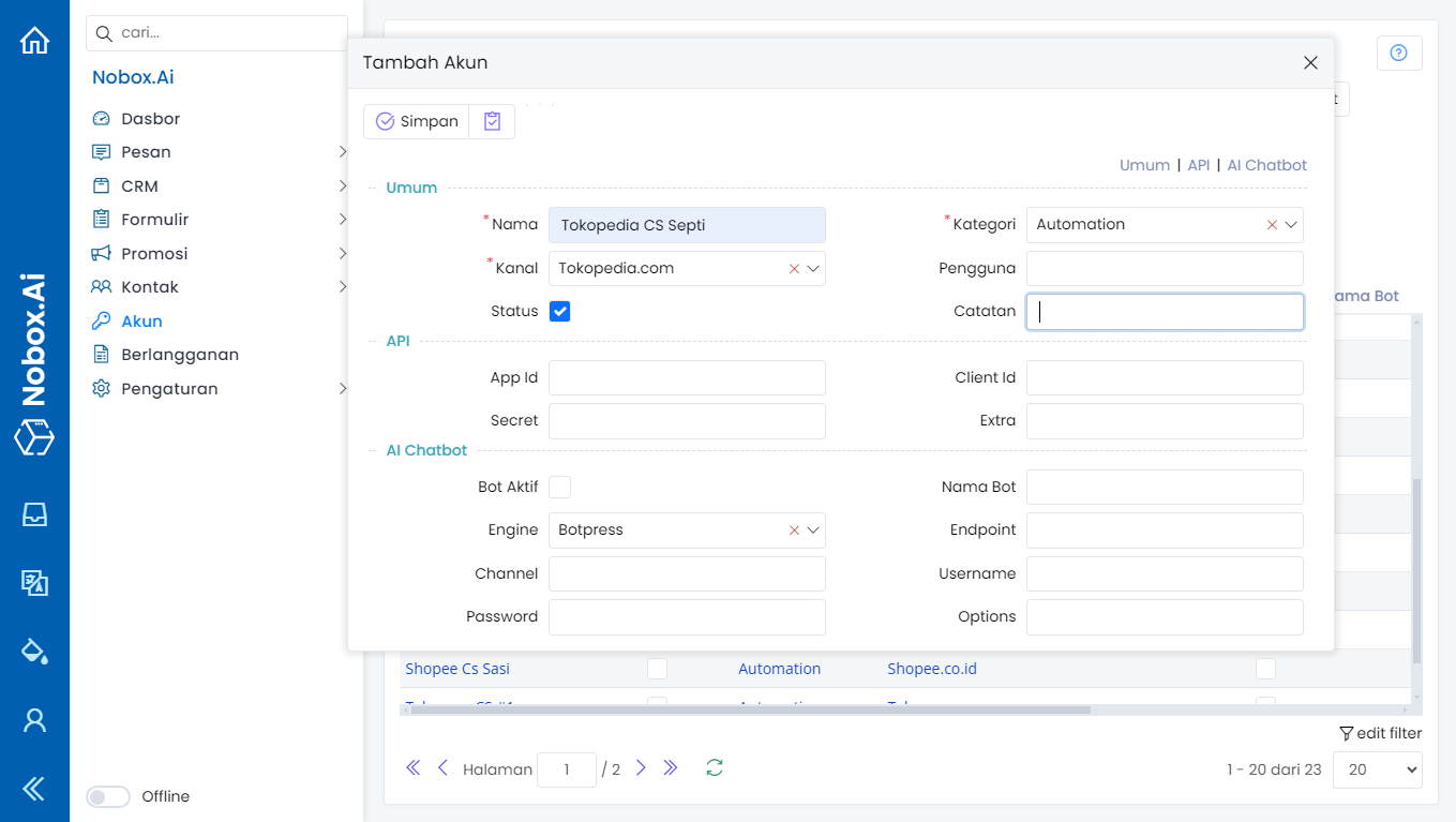 | Catatan | Berikan catatan tentang akun tersebut | - |
