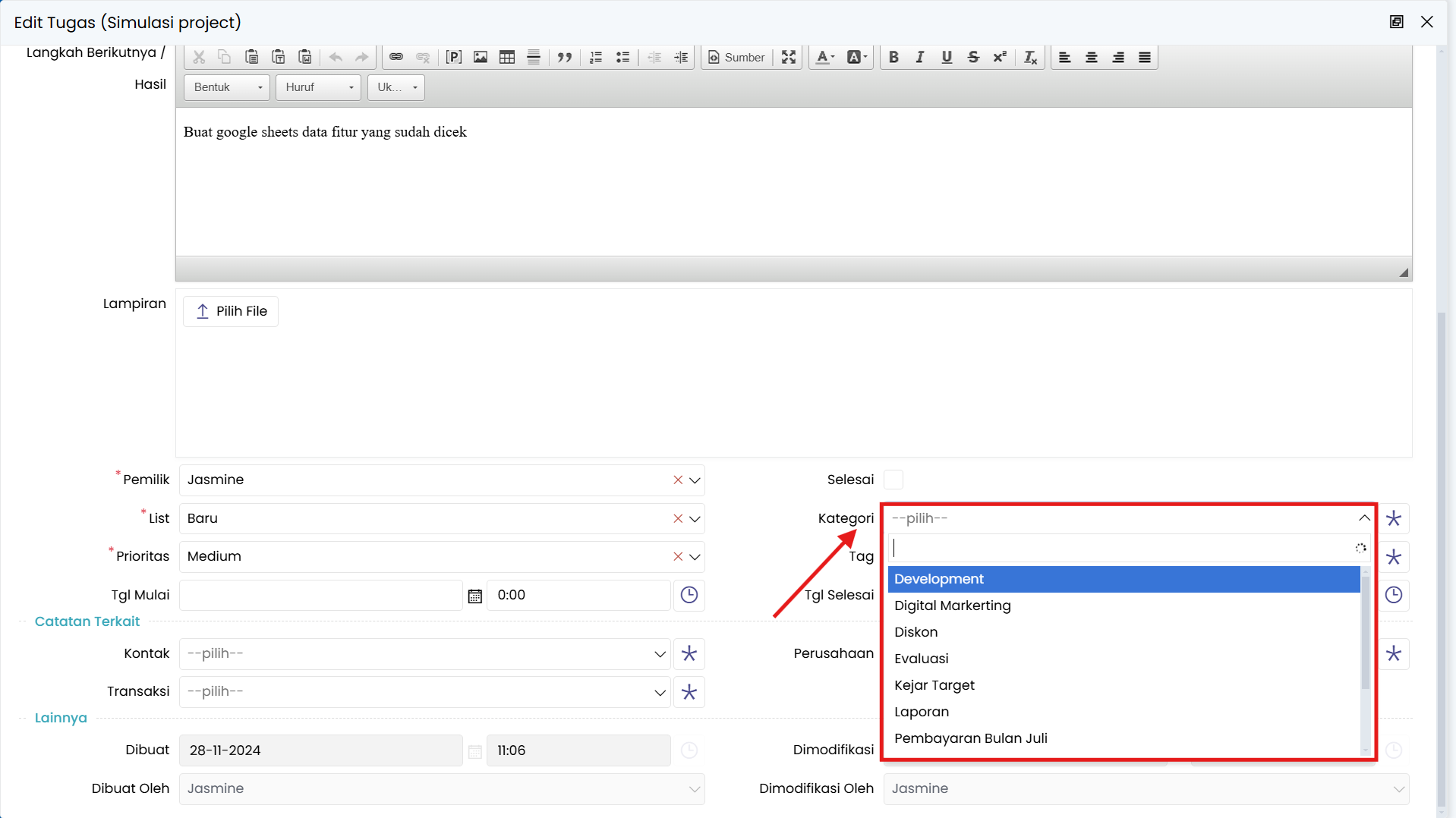 2. Klik pada bagian isian di kolom kategori, maka akan muncul kategori yang sudah dibuat sebelumnya.