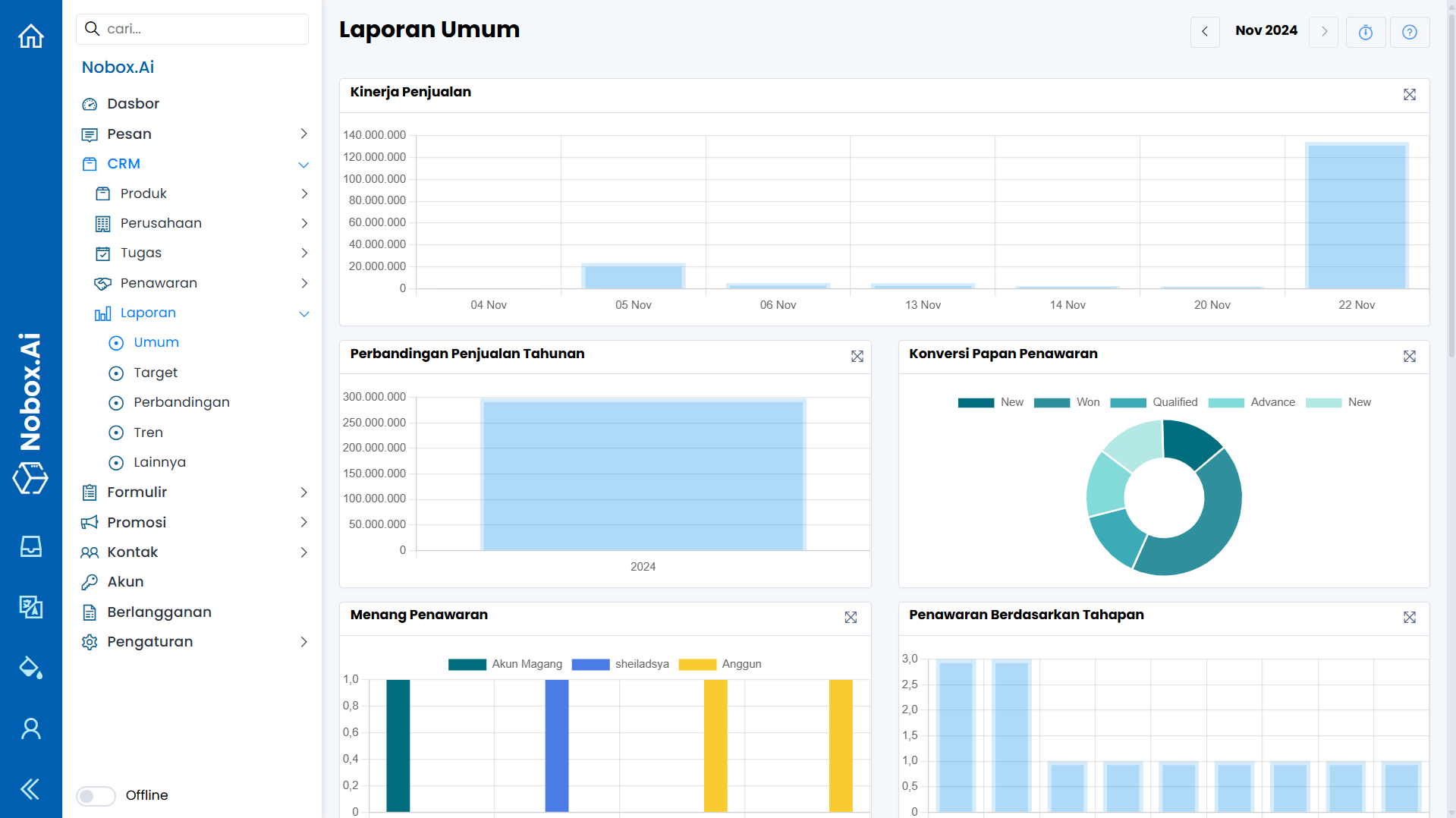 Laporan Umum merupakan salah satu menu pada Nobox.Ai yang digunakan untuk menampilkan laporan secara umum terkait informasi dari menu CRM.