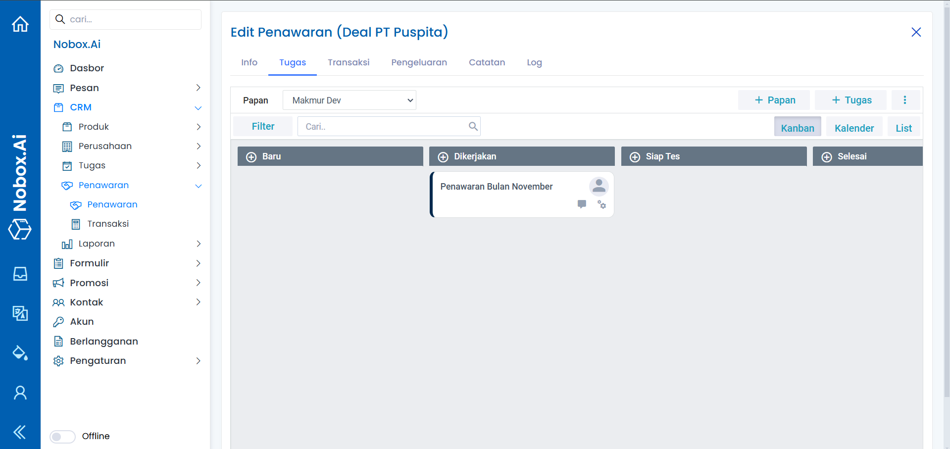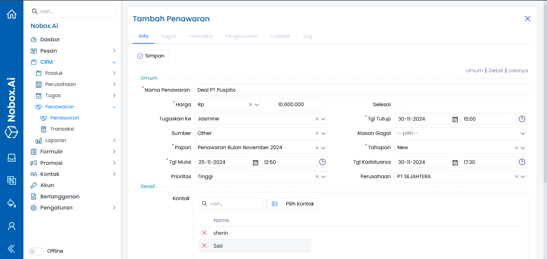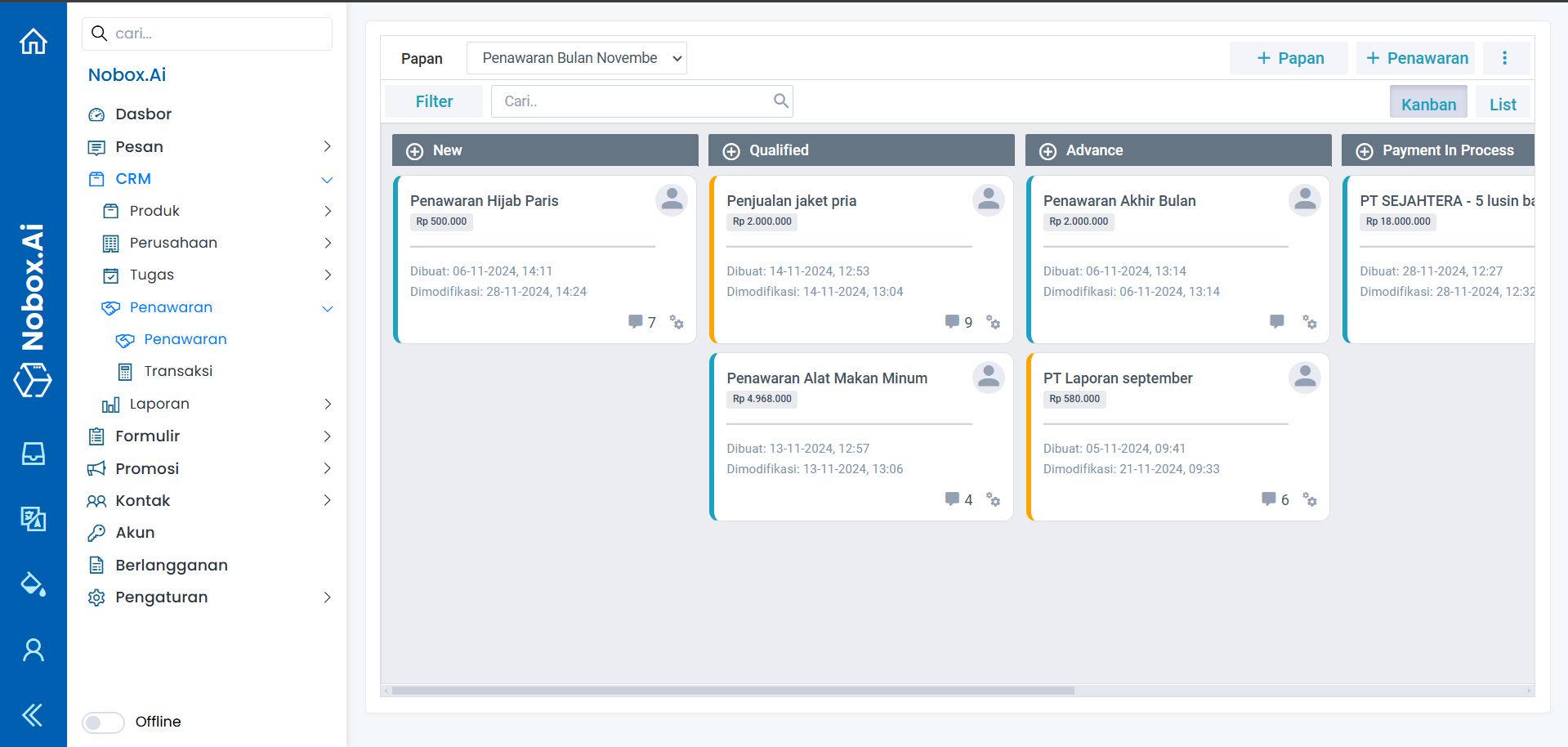 Penawaran merupakan salah satu menu pada Nobox.Ai yang digunakan untuk melakukan manajemen penawaran, sehingga mempermudah anda dalam mengelola seluruh informasi dan aktivitas progress penjualan.