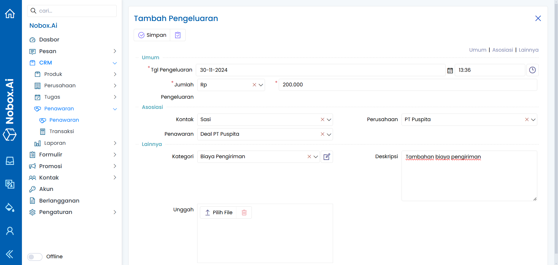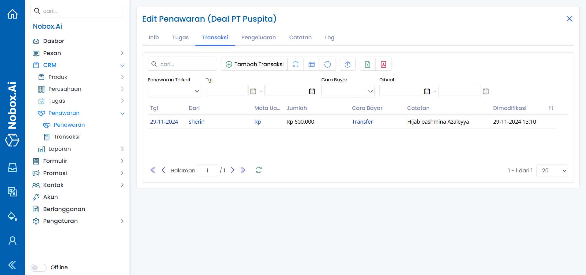 Transaksi merupakan salah satu fitur Nobox.Ai yang digunakan untuk mencatat transaksi terkait pembayaran dengan penawaran tersebut.