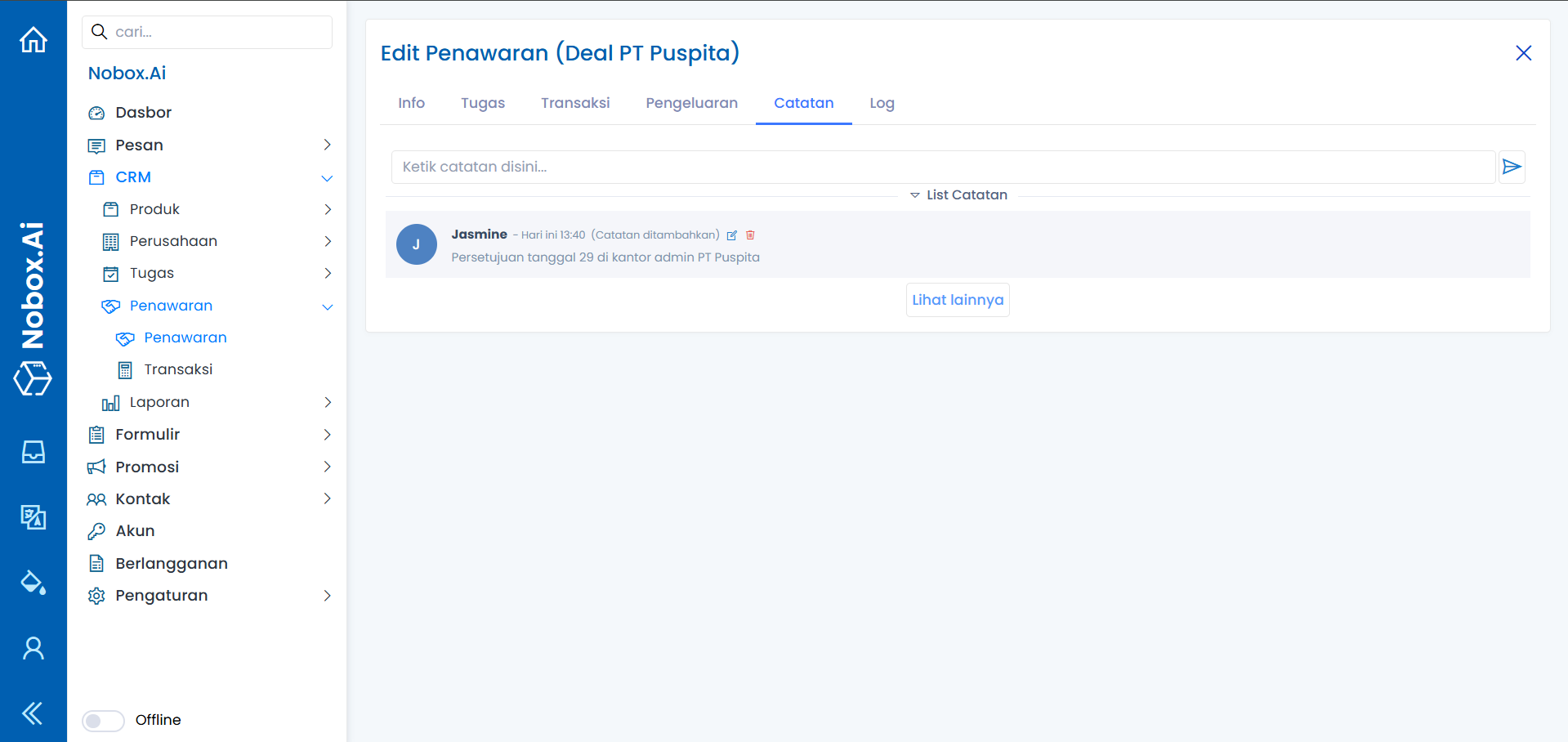 Log adalah salah satu fitur Nobox.Ai untuk memberikan informasi aktivitas terkait dengan penawaran tersebut.
