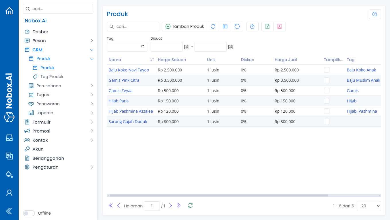 Produk adalah salah satu menu pada NoBox.Ai yang digunakan untuk manajemen data produk yang dijual.