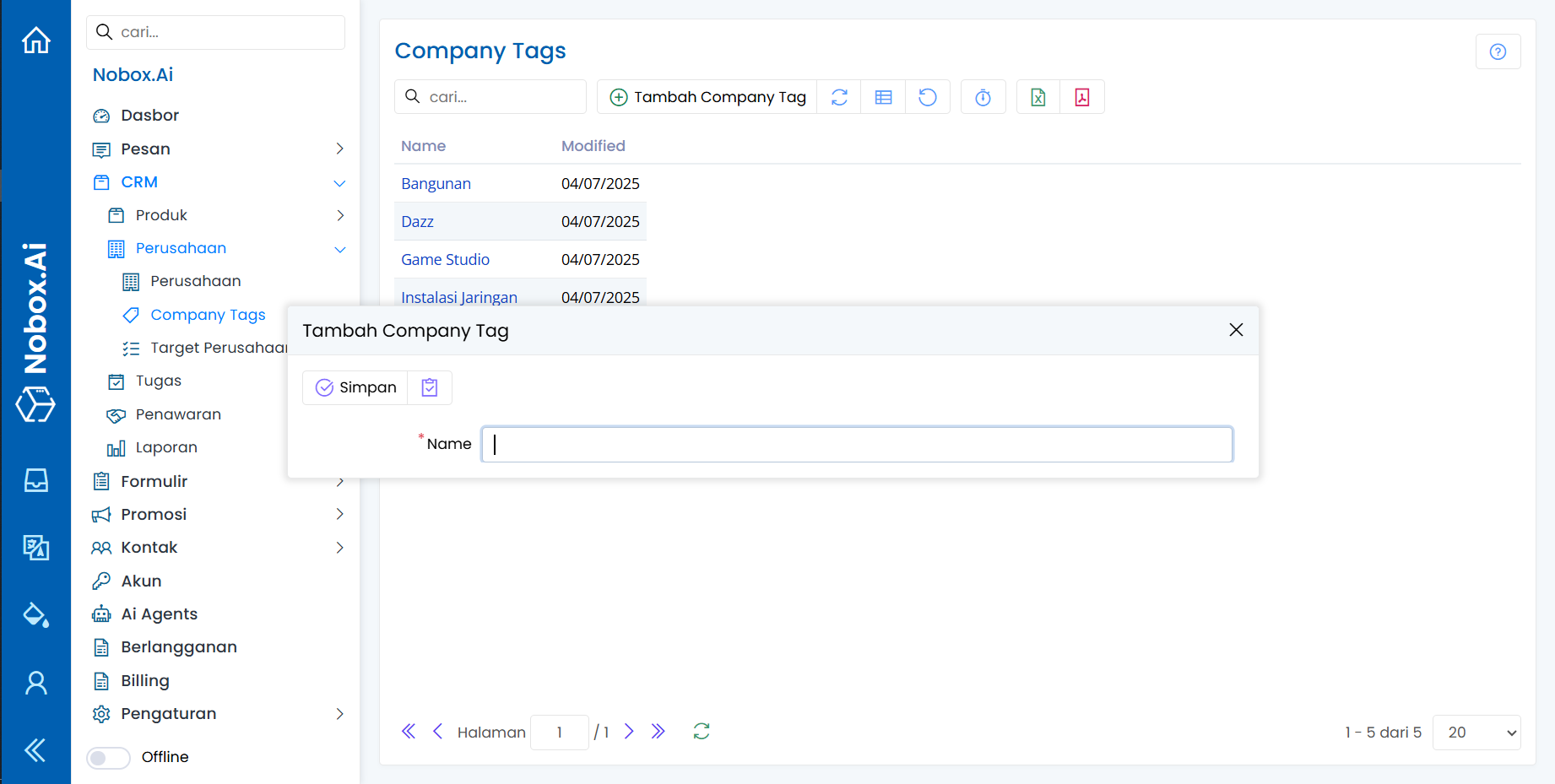 Tag Perusahaan adalah salah satu menu pada NoBox.Ai yang digunakan untuk mengelompokkan data produk Anda.