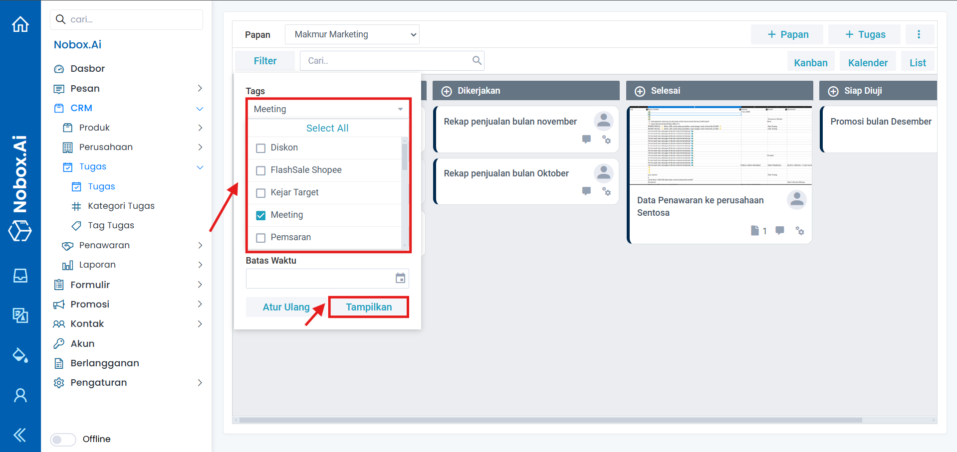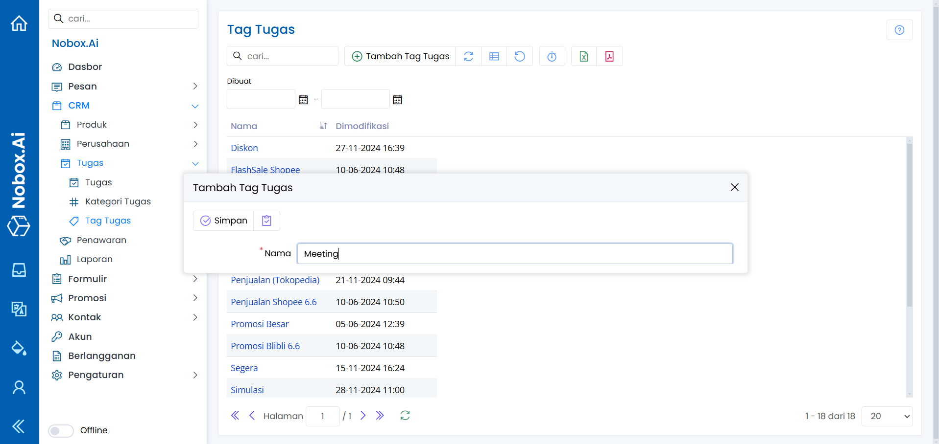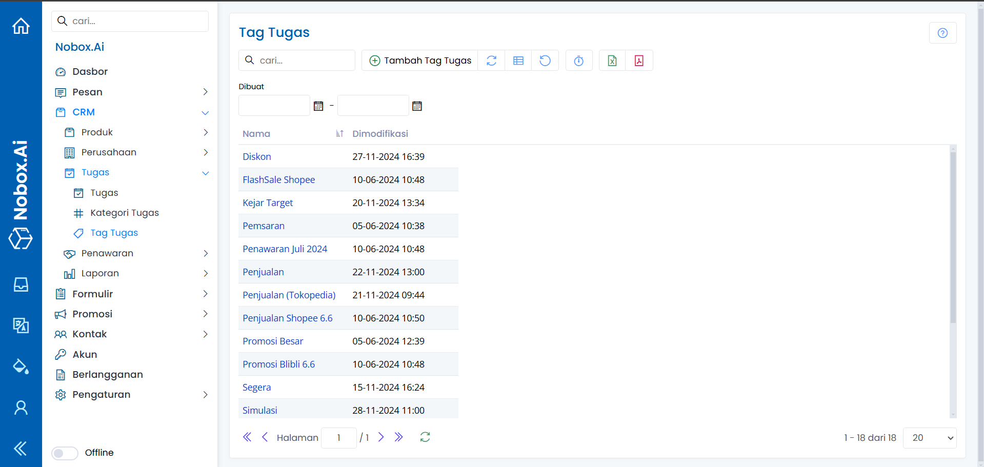 Tag Tugas adalah salah satu menu pada Nobox.Ai yang digunakan untuk mengelompokkan data tugas Anda.