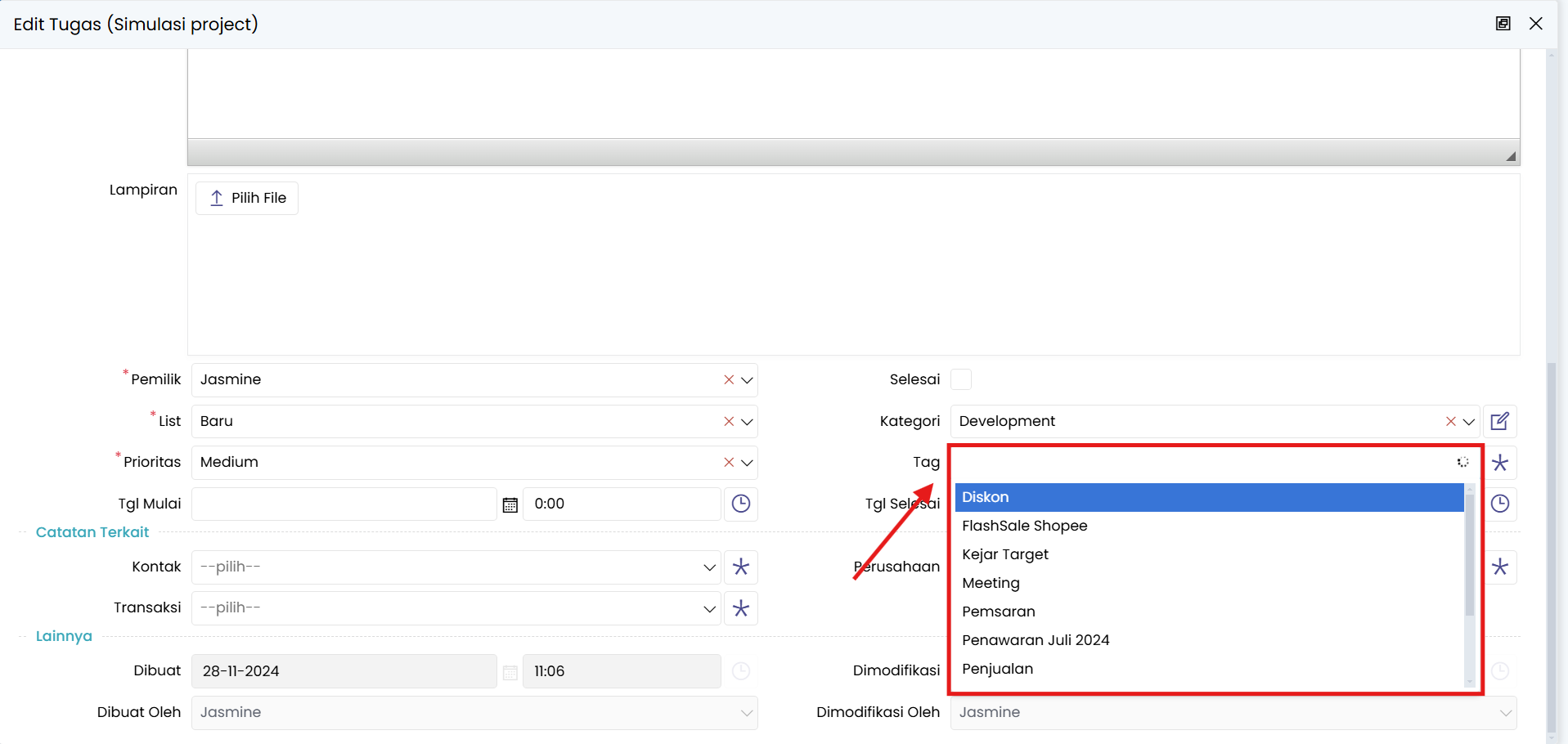 2. Klik pada bagian isian di kolom tag, maka akan muncul tag yang sudah dibuat sebelumnya.