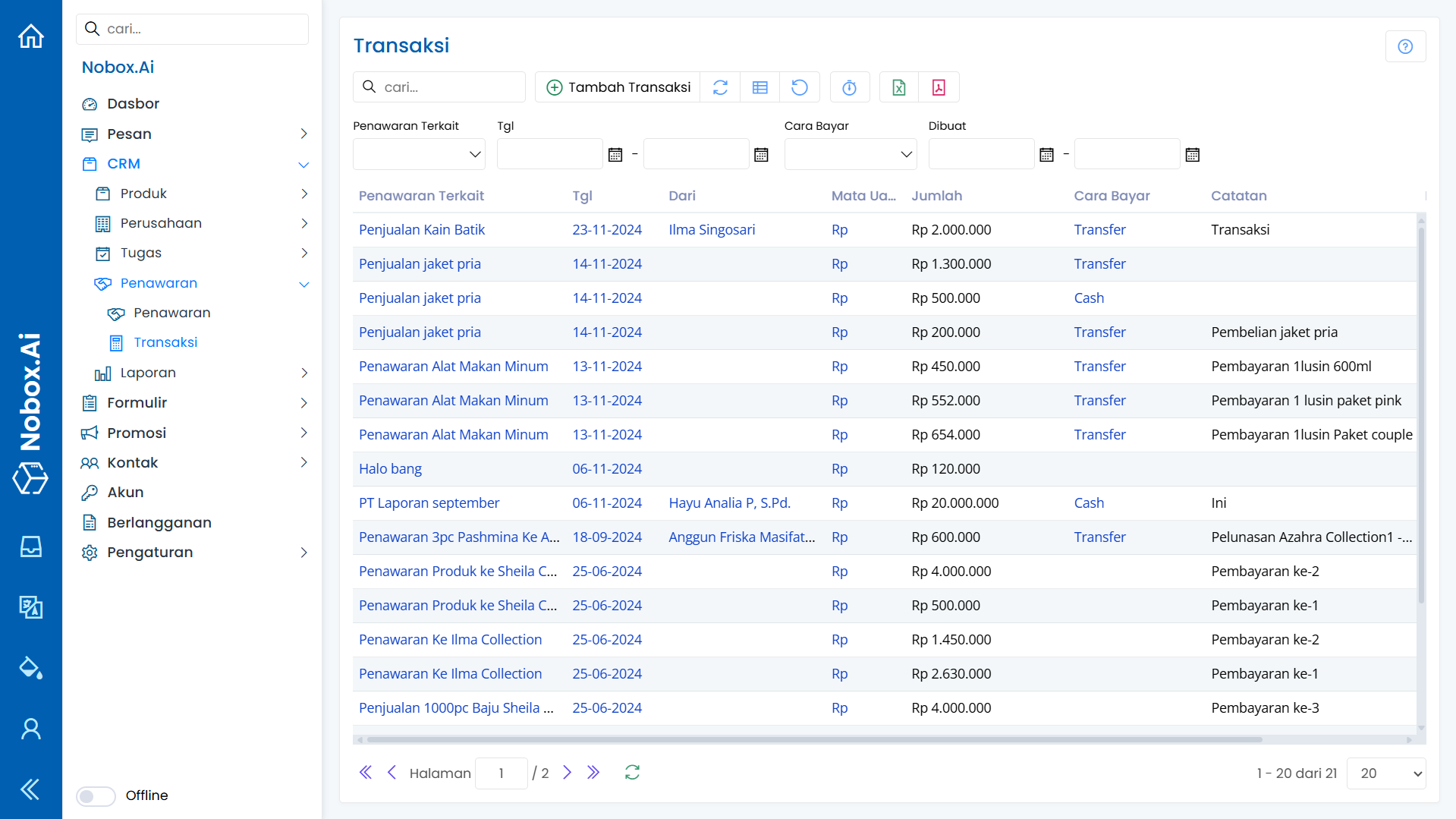 Transaksi merupakan salah satu menu Nobox.Ai yang digunakan untuk mencatat transaksi terkait pembayaran dengan penawaran.