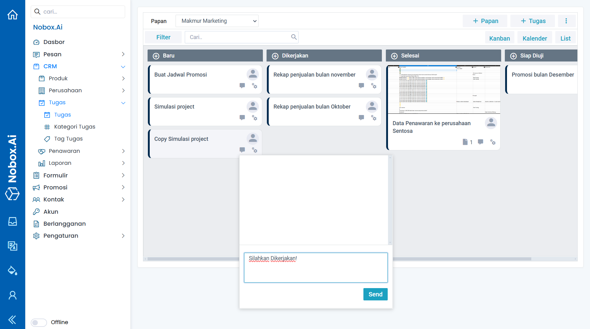 Komentar merupakan salah satu fitur Nobox.Ai yang digunakan untuk memberikan pandangan, tanggapan, atau feedback terhadap tugas tersebut.