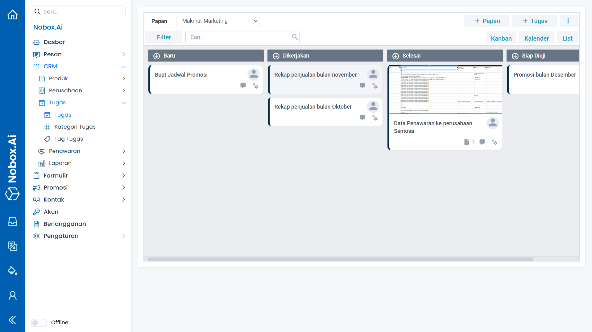 Tugas merupakan salah satu menu pada Nobox.Ai yang digunakan untuk melakukan manajemen tugas tim atau individu. Anda dapat mengelola seluruh aktivitas, tugas pengguna atau tugas yang ditunjukan untuk pengguna lain.